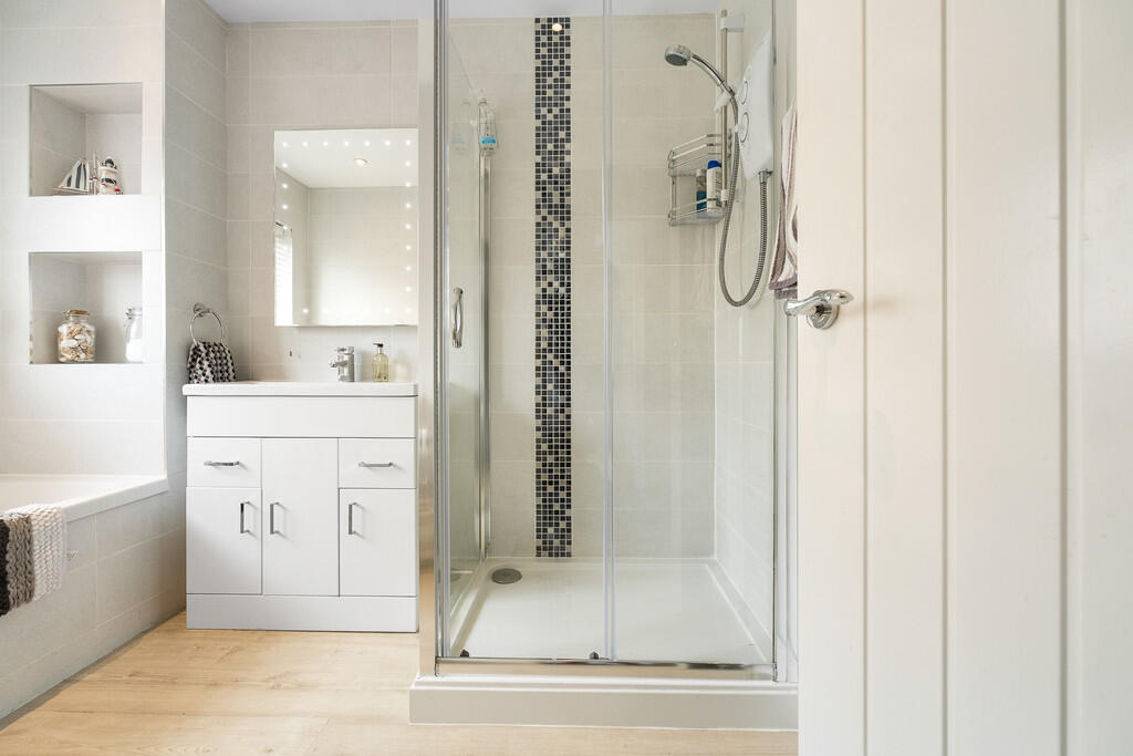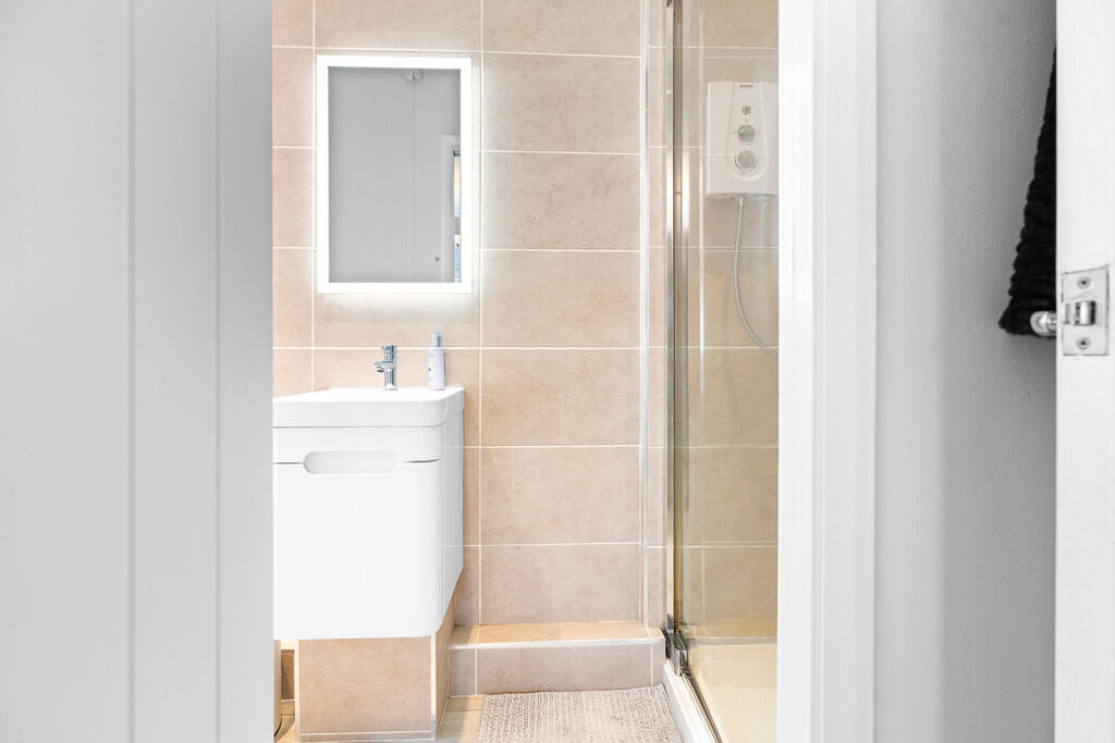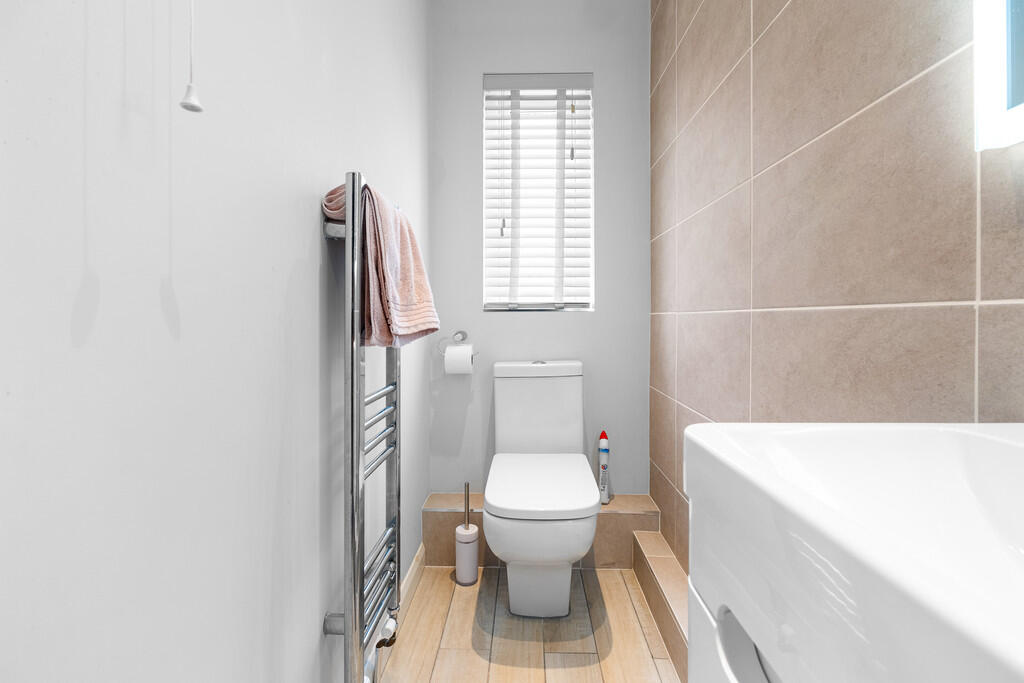 EN-SUITESHOWERROOM Quality white suite comprising low level wc, vanity wash basin with storage below and shower cubicle with glass screen door. Tiled flooring. Wall tiling to splash back areas. Obscured glass window to side. Recessed spotlights. Extractor fan. Chrome heated towel rail.