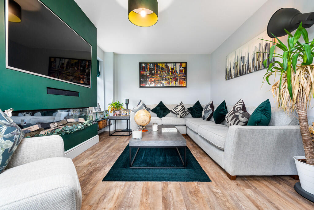 LOUNGE15' 3" x 11' 6" (4.67m x 3.51m) With window overlooking the open green space to front, additional window to side, feature media wall with inset glass fronted fire, space for 65inch tv and sound bar, quality LVT flooring and radiator.