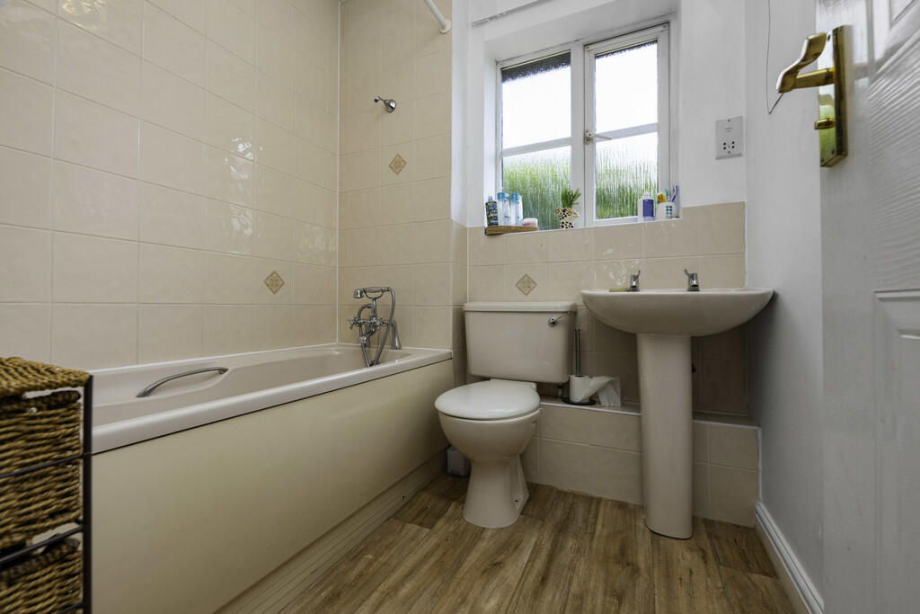 BATHROOM Fitted with a traditional three piece suite comprising bath, wc and wash hand basin. Tiled splash back with smooth walls, textured ceiling, a central light pendant and finished with vinyl flooring. Upvc double glazed obscure window to rear.