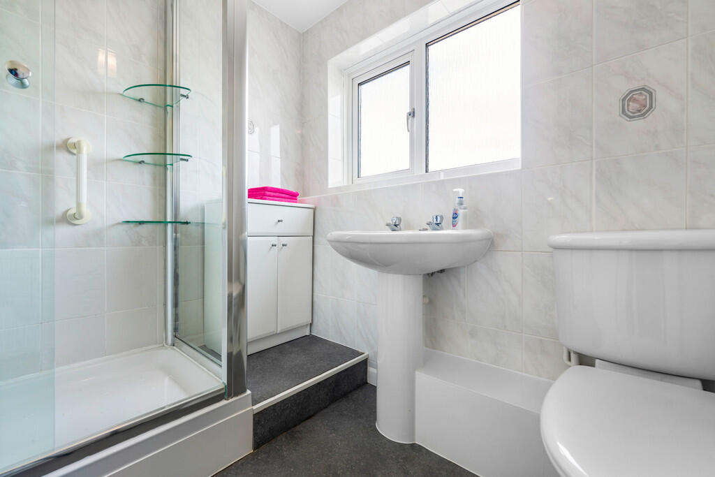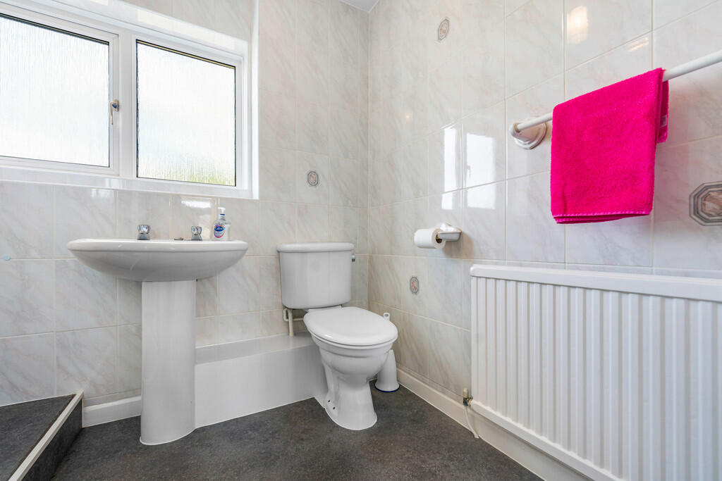 FAMILYSHOWERROOM White suite comprising low level wc, wash hand basin, large shower cubicle with 'Triton' shower. Full wall tiling. Obscure glass window to rear. Radiator.