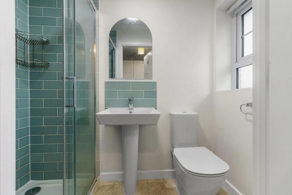 EN-SUITE6' 10" x 3' 10" (2.10m x 1.18m) Low level WC, pedestal wash hand basin and double shower cubicle with sliding door and electric shower over. Tiled splash backs. Extractor fan. uPVC double glazed window to rear. Ladder radiator.