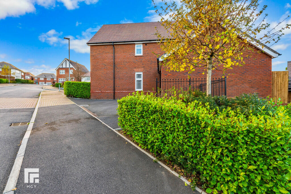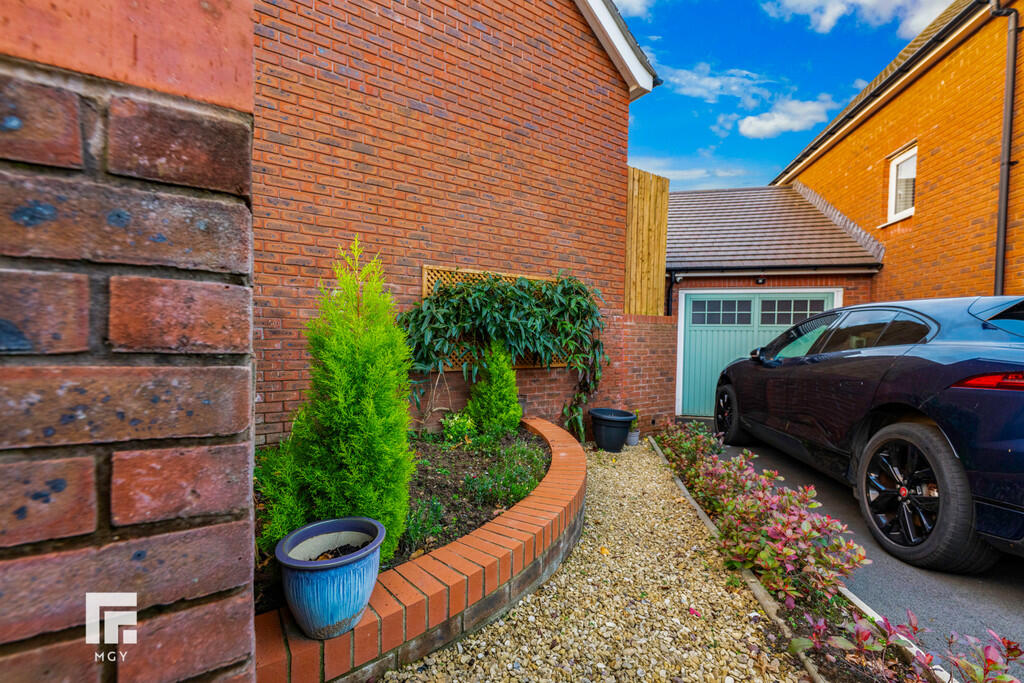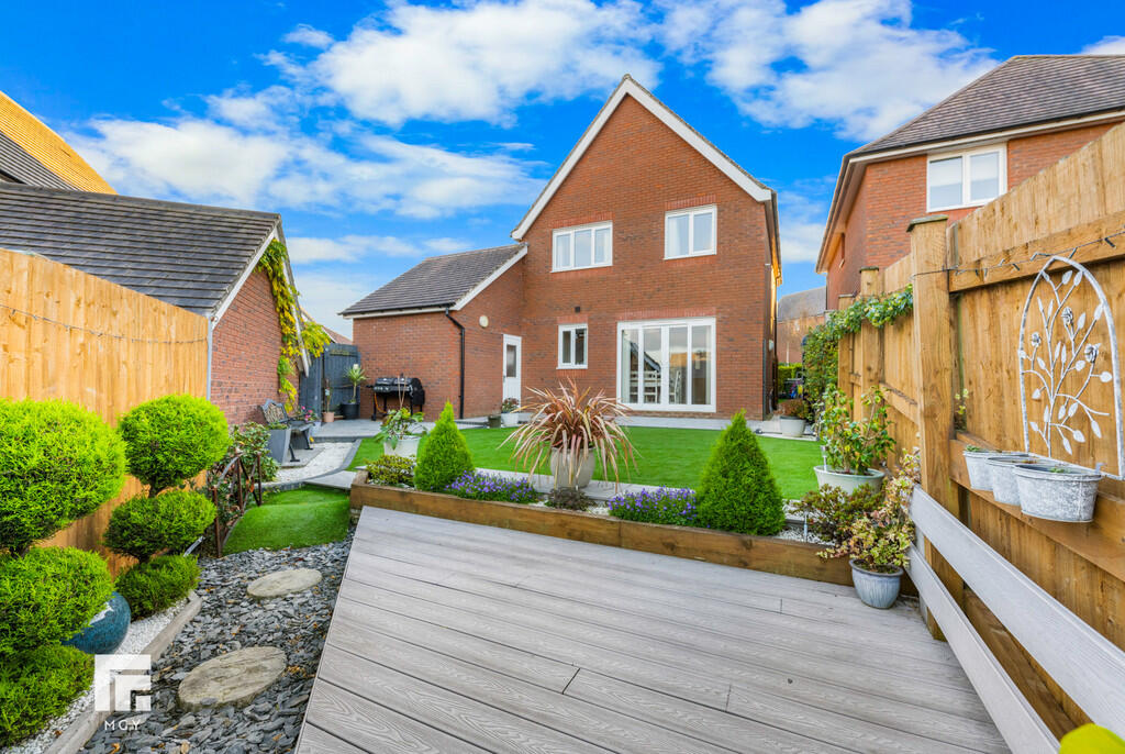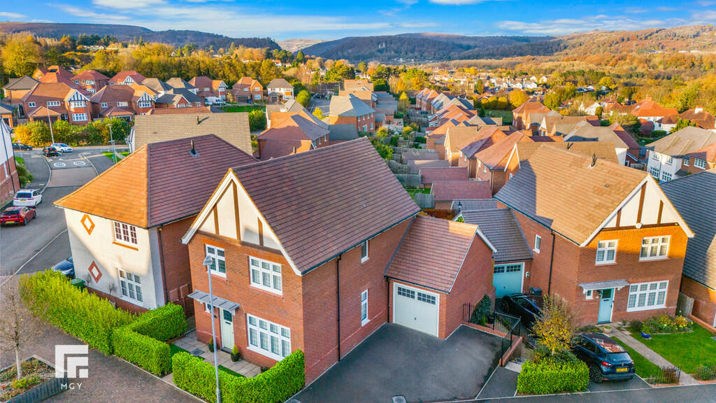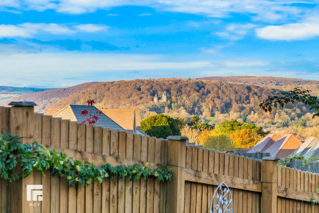 FRONTGARDEN Neatly tended hedgerow to front with central paved pathway with artificial lawn to sides leading to front door. Additional rear composite decked relaxation area. Inset beds of plants and shrubs. The rear garden enjoys elevated views towards castell coch. Enclosed by timber fencing. Timber gate giving access to front. Outside light. Double side by side driveway leading to garage.
