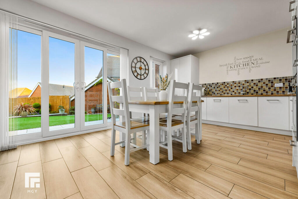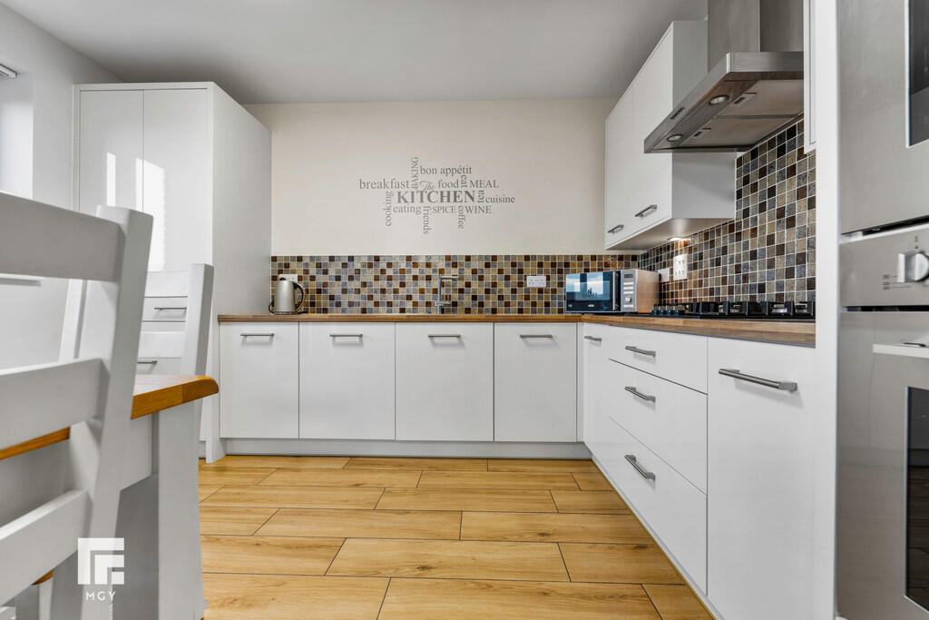 KITCHEN/DININGROOM18' 6" x 12' 1" (5.64m x 3.69m) Well appointed along two sides in high gloss fronts beneath wood grain effect worktop surface, inset 1.5 bowl stainless steel sink with side drainer, inset four ring 'Bosch' gas hob with 'Smeg' extractor hood above, integrated two 'Smeg' ovens, integrated fridge freezer, matching range of eye level wall cupboards, utility cupboard with plumbing for dishwasher and space for tumble dryer. Space for large family dining table, sliding doors to rear garden with windows to either side, additional window to rear and radiator.