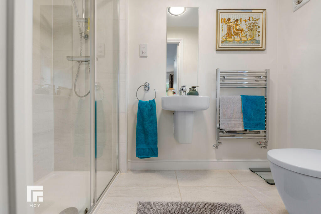 ENSUITESHOWERROOM Modern white suite comprising low level W.C, wash hand basin, double width shower cubicle with chrome shower above, extractor fan, wall tiling to splash back areas, tiled flooring, window to side, electric shaver point and chrome heated towel rail.