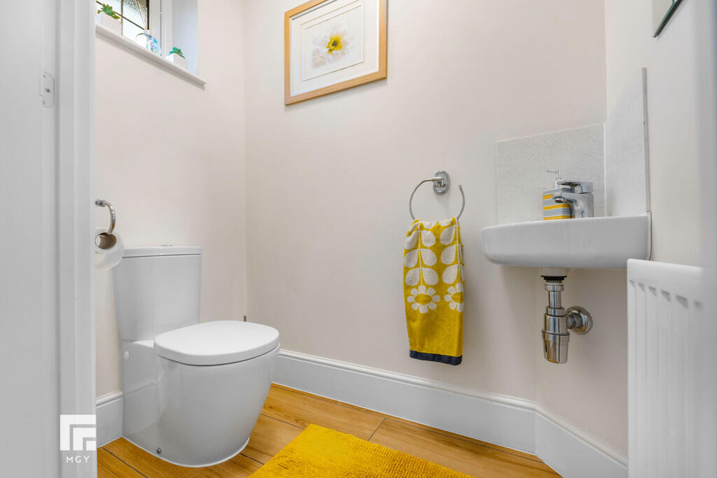 CLOAKROOM White suite comprising low level W.C, wash hand basin, tiled splash back, obscure glass window to front, tiled flooring and radiator.