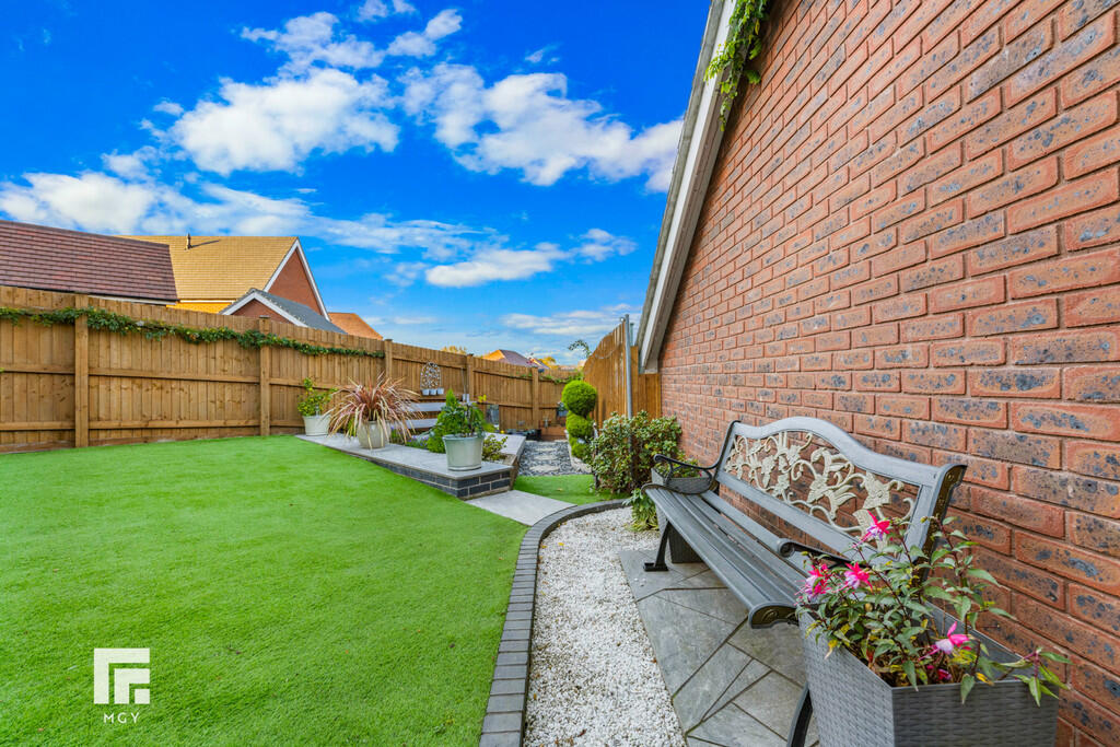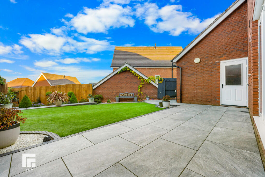 REARGARDEN A beautifully landscaped rear garden with large paved patio leading onto an area of artificial lawn