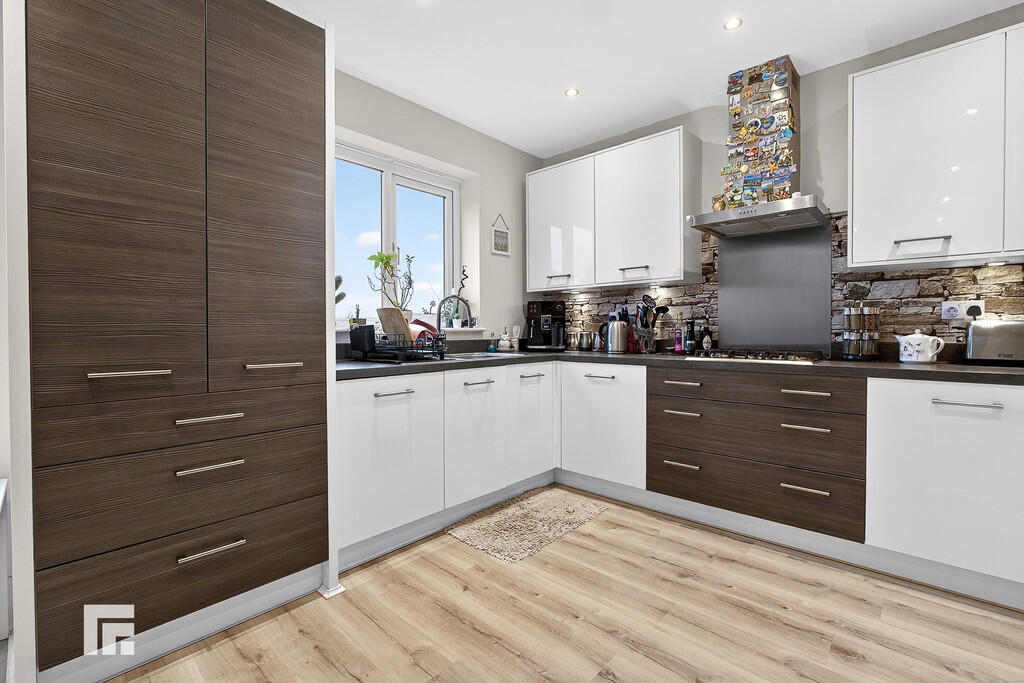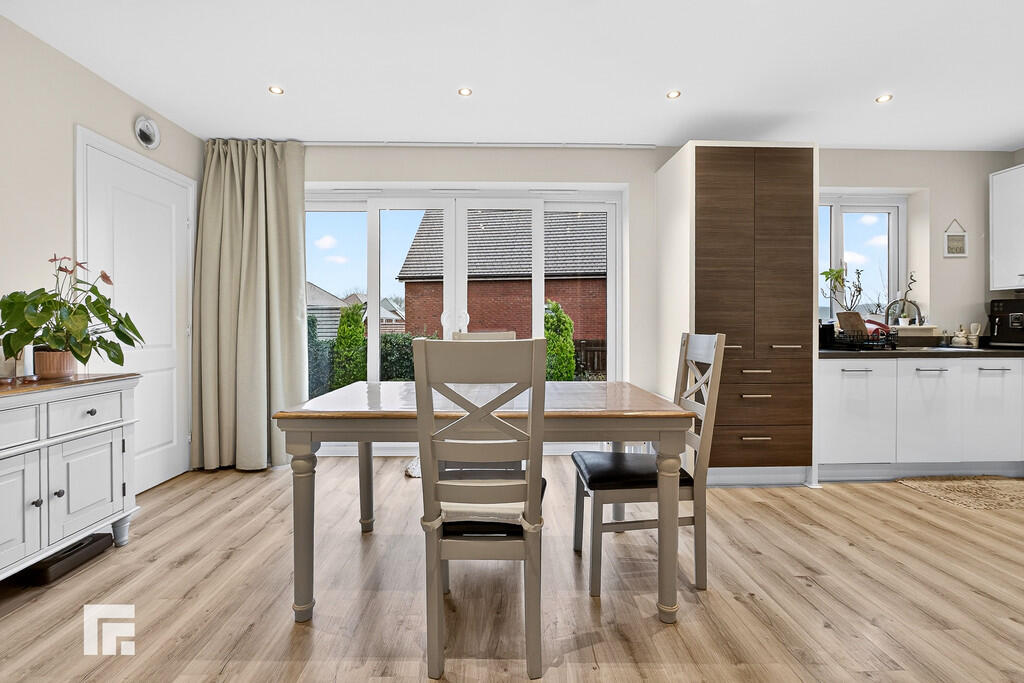 KITCHENANDDINER21' 6" x 11' 5" (6.57m x 3.48m) A spacious kitchen and diner with modern kitchen well appointed along three sides in high gloss fronts beneath laminate worktop surfaces. Inset 1.5 bowl stainless steel sink with side drainer. Inset four ring gas hob with cooker hood above. Integrated double ovens. Matching range of eye level wall cupboards. Integrate fridge freezer. Integrated dishwasher. Under stairs storage cupboard. Window to rear. Sliding doors to the rear garden. Ample space for large family dining and seating area. Quality laminate flooring. Radiator. Door to utility room.