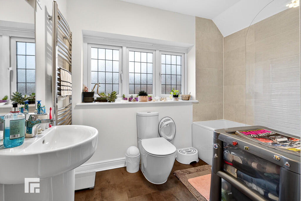 FAMILYBATHROOM8' 5" x 8' 2" (2.57m x 2.50m) A sizeable family bathroom. Modern white suite comprising low level wc, wash hand basin, panelled bath with chrome shower above and swivel shower screen. Tiled splash back. Large obscured glass window to front. Electric shaver point. Airing cupboard housing the hot water cylinder. Extractor fan. Chrome heated towel rail.