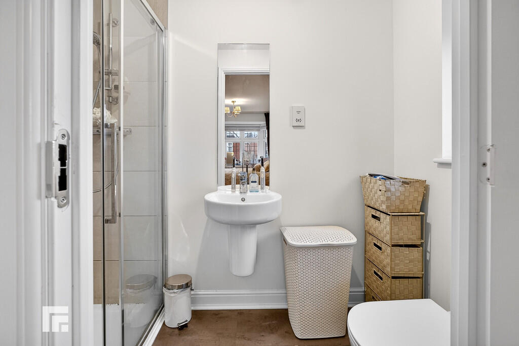 ENSUITESHOWERROOM Quality white suite comprising low level wc, wash hand basin, large shower cubicle with chrome shower above. Tiled splash back. Obscured glass window to side. Electric shaver point. Extractor fan. Chrome heated towel rail.