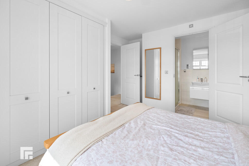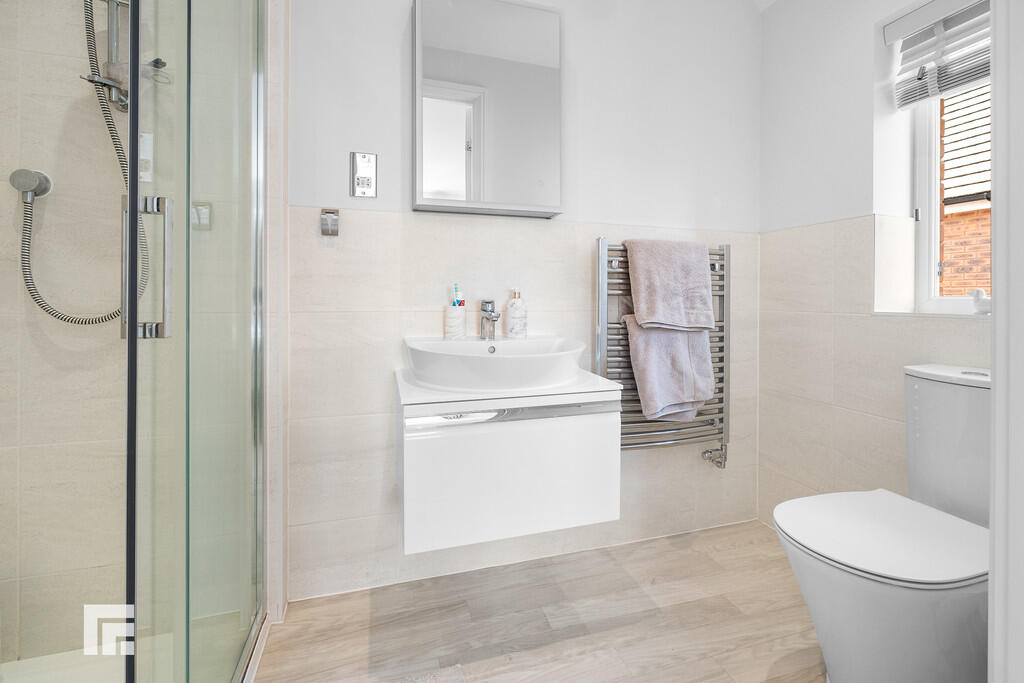 ENSUITE8' 7" x 4' 2" (2.63m x 1.28m) Low level WC, vanity enclosed wash hand basin and double shower cubicle with glass screen. Part tiled walls. LVT flooring. Extractor fan. Spotlights. Ladder radiator. uPVC double glazed window to side.
