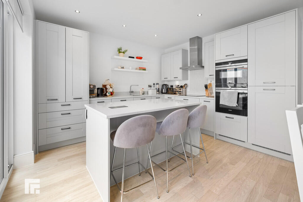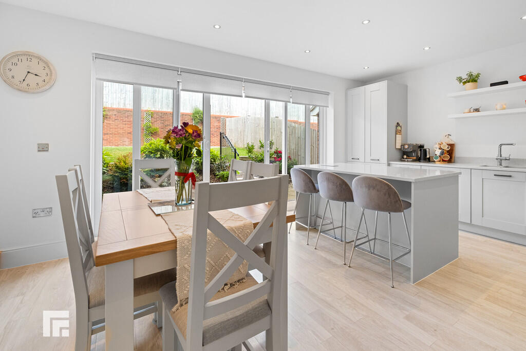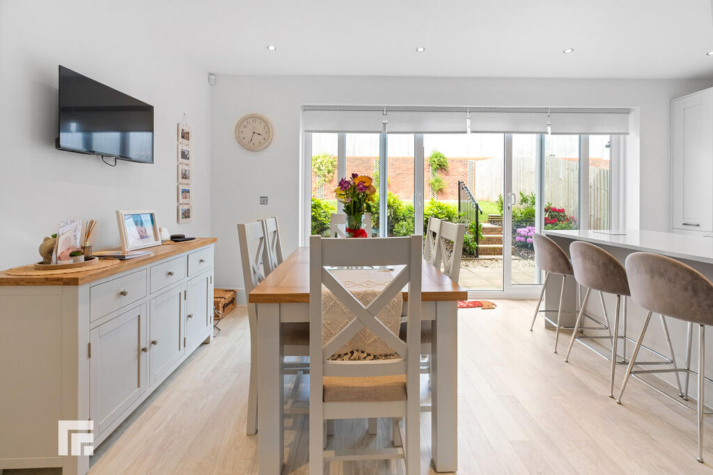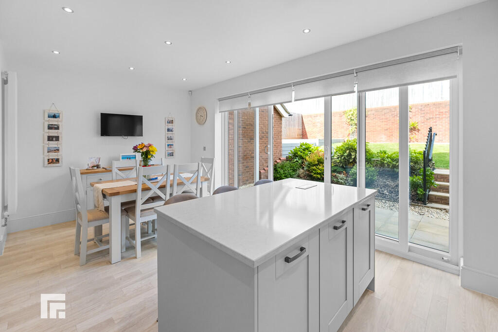 KITCHEN/DININGROOM18' 9" x 13' 1" (5.74m x 4.00m) A stylish kitchen fitted with a wide range of base and eye level units incorporating one and a half bowl stainless steel sink with complementary Quartz work surfaces. Fitted double electric microwave/oven, induction hob with extractor hood over. Integrated fridge/freezer and dishwasher. Feature central island with Quartz breakfast bar and hidden power points. LVT flooring. Spotlights. uPVC double glazed sliding patio doors to landscaped rear garden. Utility cupboard housing washing machine and tumble dryer. Column radiator.