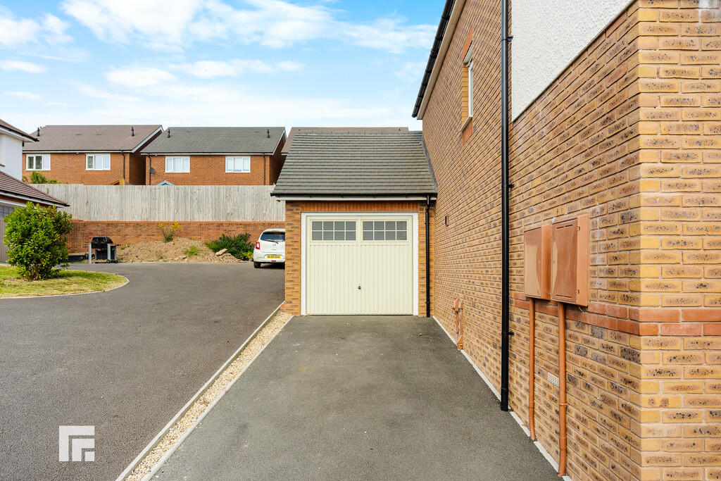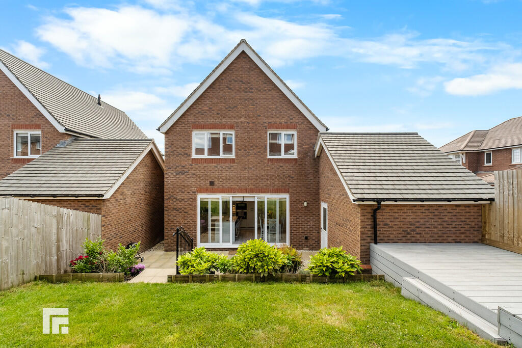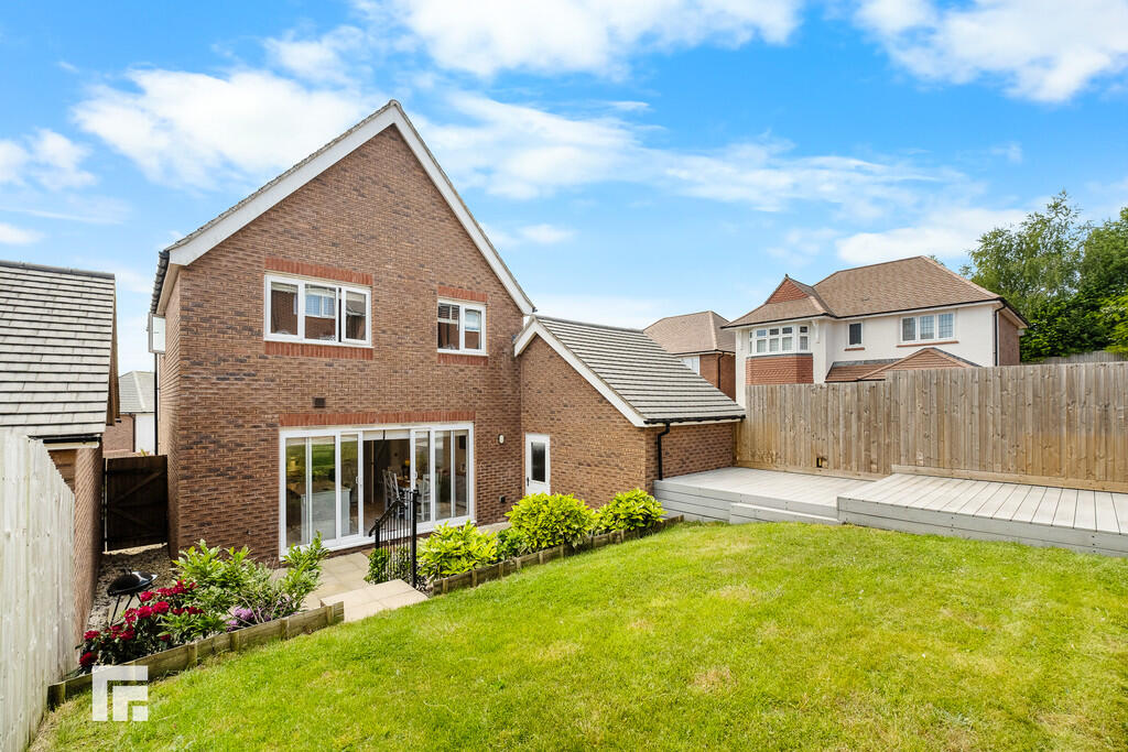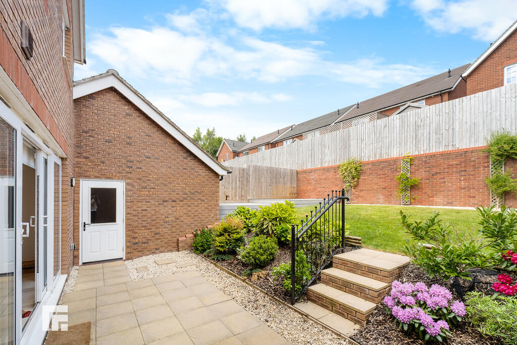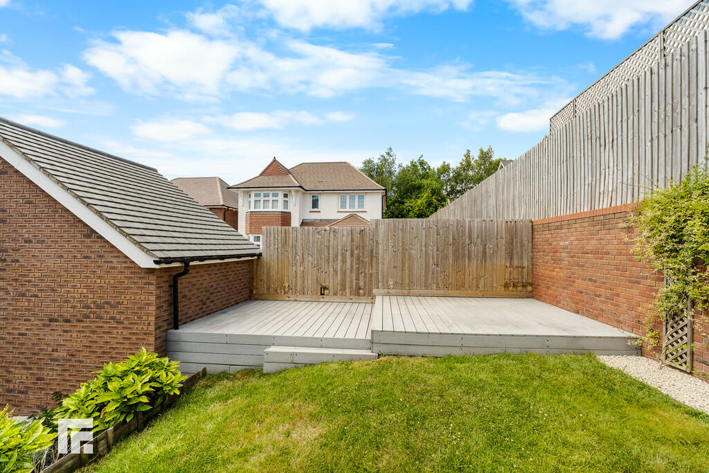 REARGARDEN A landscaped rear garden mainly laid to lawn with composite decking and full width paved patio. Shrub borders. Boundary wall and fence. Gated sided access and pedestrian door to garage. Outside tap. External power points and lighting.