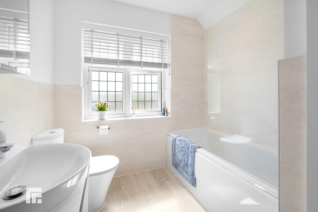 BATHROOM8' 6" x 6' 10" (max)(2.60m x 2.09m) The suite comprises; low level WC, vanity enclosed wash hand basin and panelled bath with shower over and glass screen. Part tiled walls. LVT flooring. Extractor fan. Spotlights. Ladder radiator. uPVC double glazed window to front. Large storage cupboard.