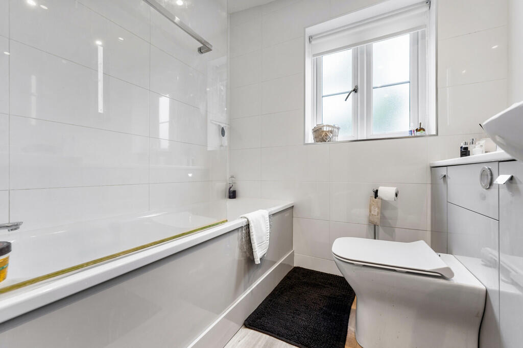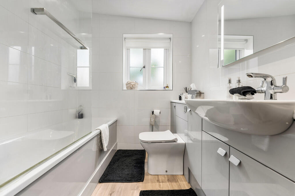 FAMILYBATHROOM Modern white suite comprising low level wc, vanity wash basin with storage below, panelled bath with chrome shower above, swivel shower screen, obscure glass window to side, full wall tiling, recessed spotlights and chrome heated towel rail.