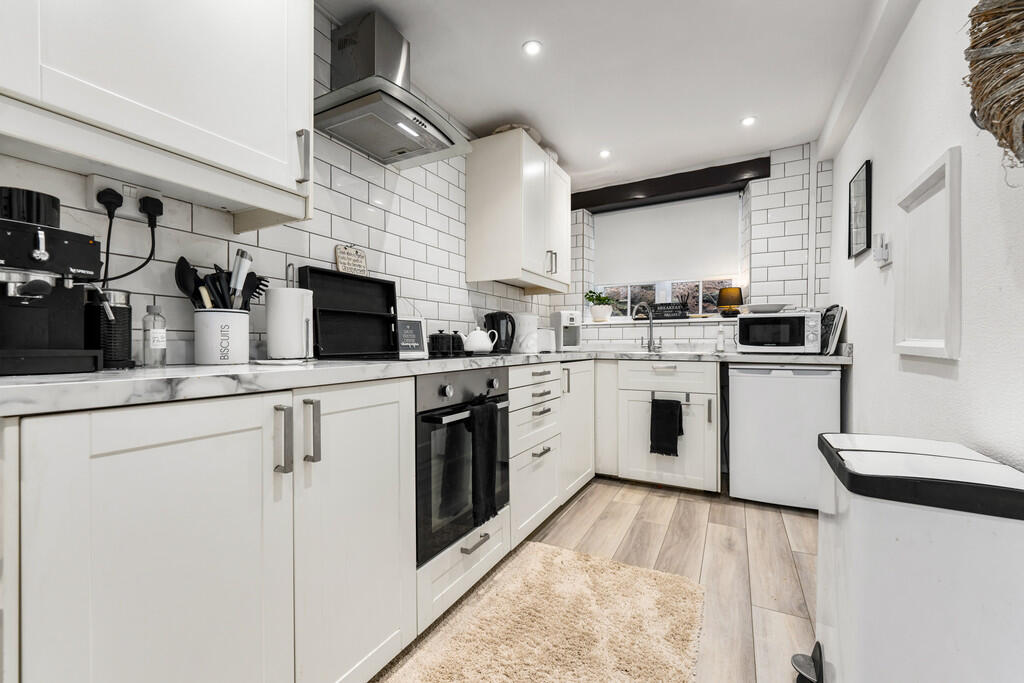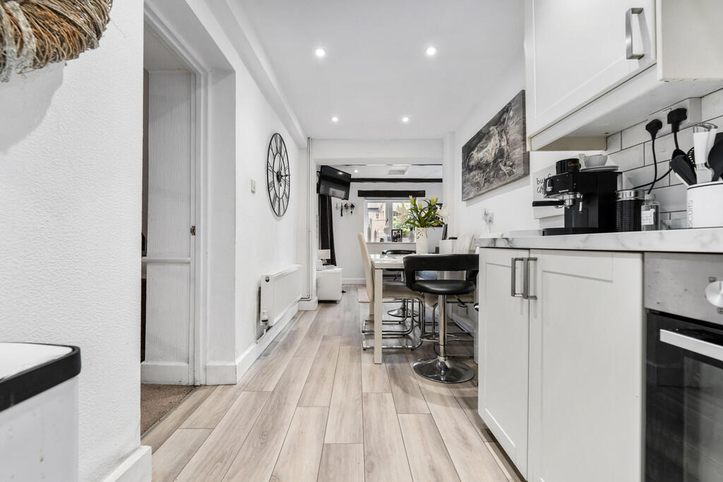 KITCHEN/DINING/SITTINGROOM29160' 5" x 9' 4" (8888.12m x 2.85m) With kitchen units and worktops to two sides, inset stainless steel sink with side drainer, inset four ring hob with oven below, curved glass cooker hood above, matching range of eye level wall cupboards, ample space for family dining and seating area, laminate flooring, three windows and door to side. Recessed spotlights. Radiator.