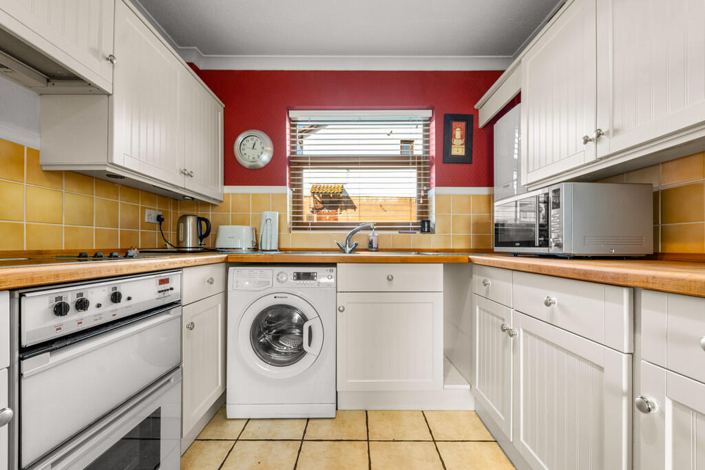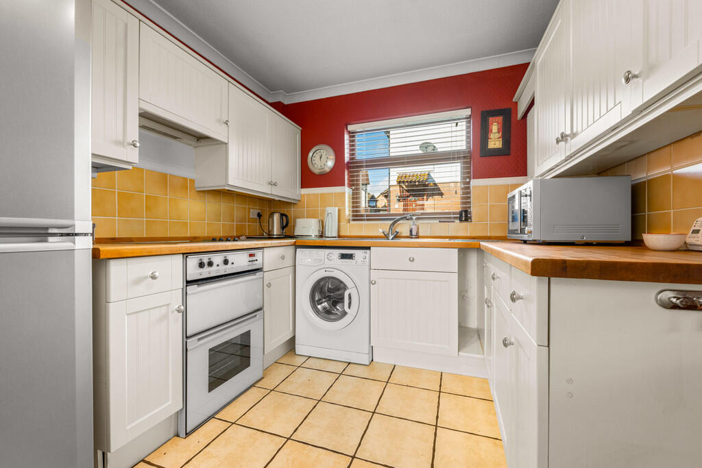 KITCHEN8' 6" x 9' 2" (2.59m x 2.79m) Fitted with a range of base and eye level units with worktops over. Built in double oven, electric hob and cooker hood over. Inset stainless steel sink unit plus drainer. Space for free standing fridge/freezer and washing machine. Upvc double glazed window to front and Upvc double glazed door leading to the side. Tiled splash back with wall papered walls, textured ceilings, a central light pendant finished with tiled flooring.