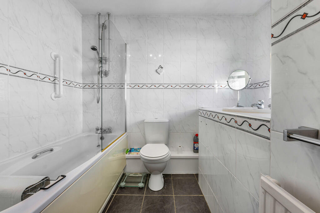 BATHROOM Fitted with a three piece bathroom suite comprising bath with shower over, WC and wash hand basing. Upvc double glazed window to front. Tiled walls and floors with a central light pendant.