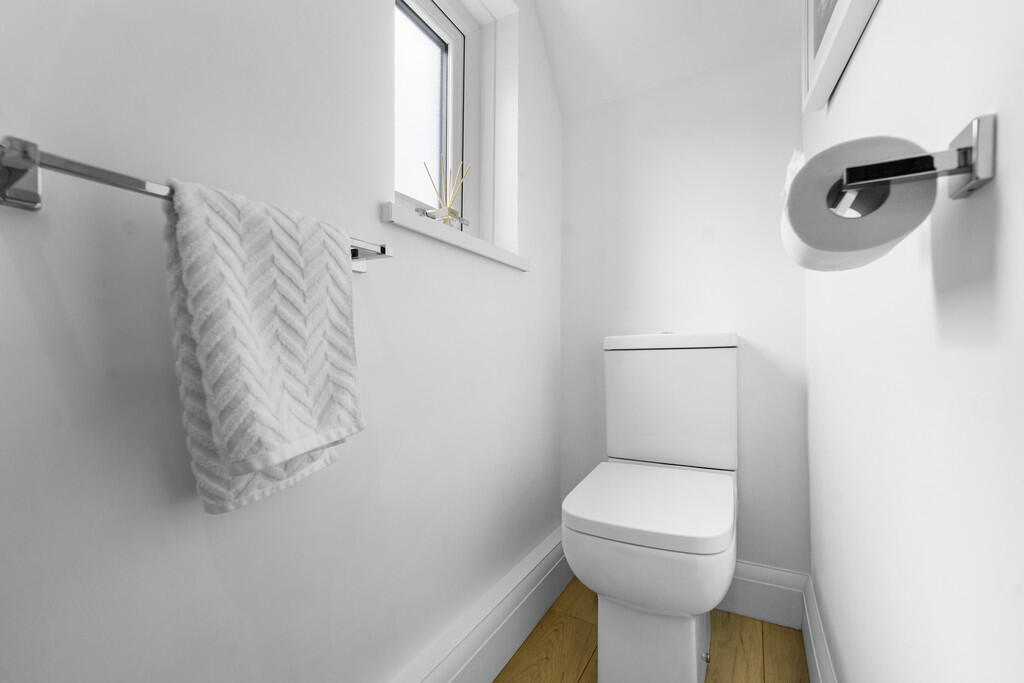 CLOAKROOM Modern white suite comprising low level wc, wash hand basin. Engineered wood flooring. Obscured glass window to side.