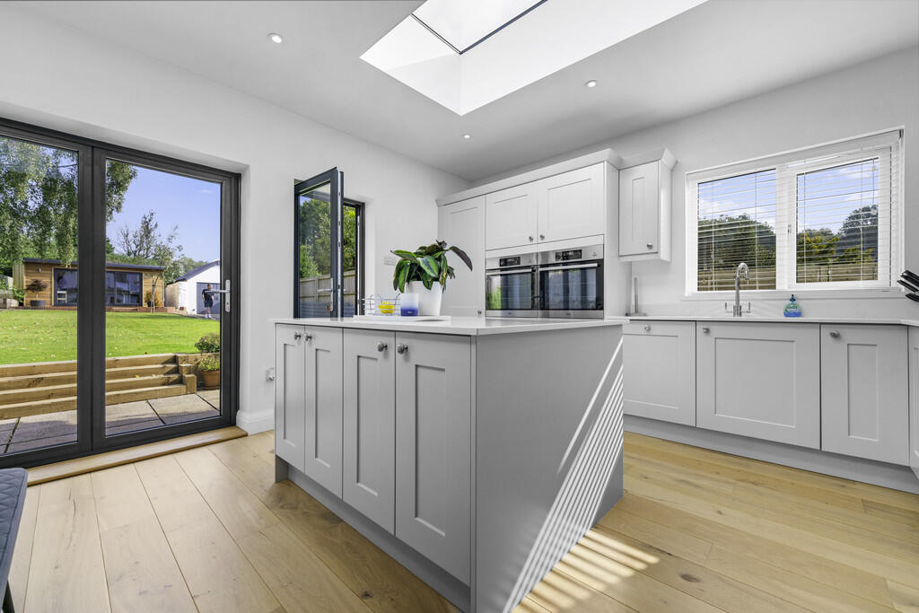 KITCHEN,DININGANDFAMILYROOM26' 7" x 17' 4" (8.11m x 5.29 (overall)m) An exceptional kitchen, dining and family room. With kitchen to the rear, well appointed along two sides in shaker style light grey fronts beneath quartz worktop surfaces. Inset 1.5 bowl stainless steel sink with worktop side drainer. Inset four ring 'AEG' induction hob with 'AEG' cooker hood above. Integrated two 'AEG' ovens and grill. Integrated 'Samsung' fridge freezer. Integrated 'Neff' dishwasher. Large central island with matching units and quartz worktop. Large space for family dining table. Folding doors opening to the rear garden. Windows to rear pitch and windows to side. Family seating area with chimney breast and inset 'Chilli Penguin' cast iron wood burner. Engineered wood flooring. Two modern column radiators. Recessed spotlights.
