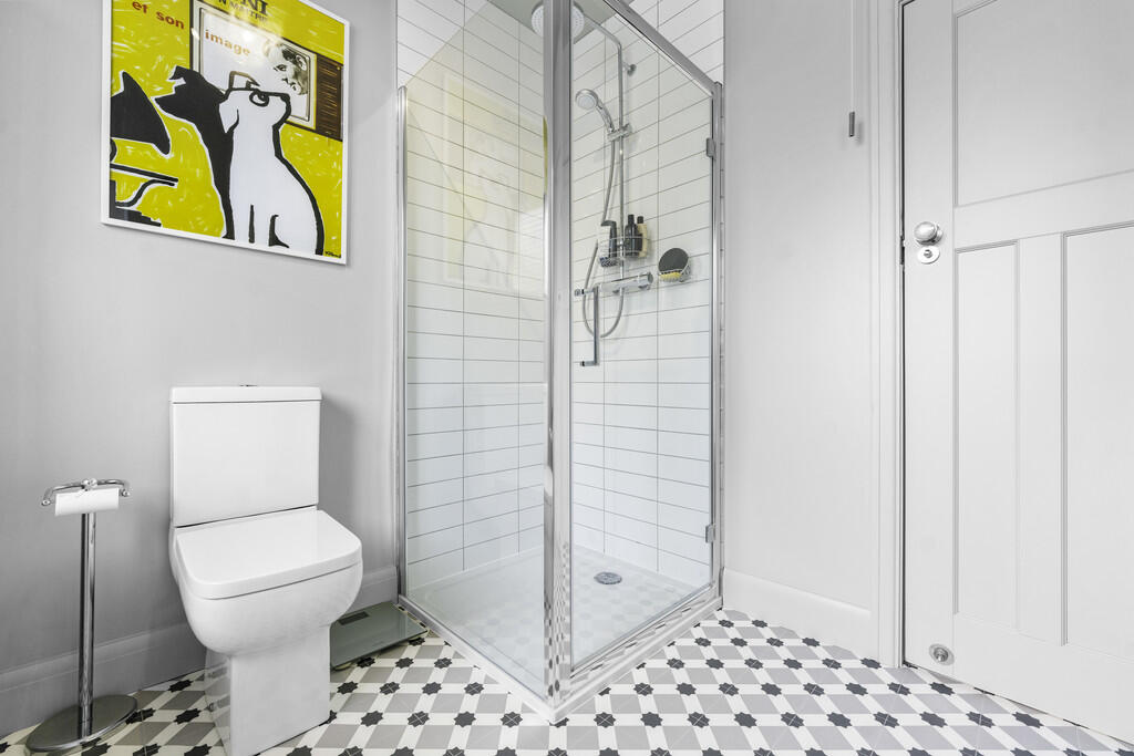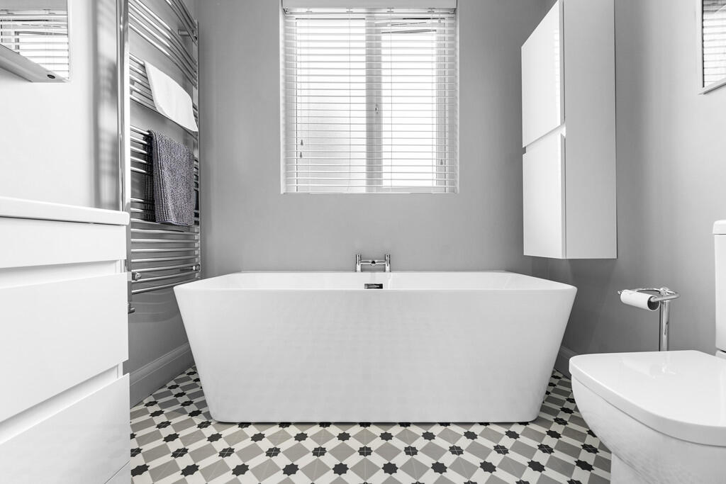 FAMILYBATHROOM8' 6" x 7' 4" (2.60m x 2.24m) A spacious family bathroom. Modern white suite; low level WC, wash hand basin with chrome mixer tap and vanity, freestanding bath with chrome mixer tap, Glass shower cubicle with dual headed, chrome, rainfall shower. Extractor fan. Tiled splashbacks. Tiled flooring. Chrome heated towel rail. Obscured glass window to rear.