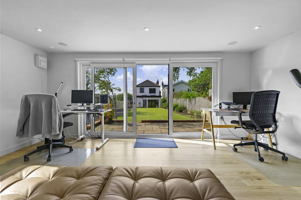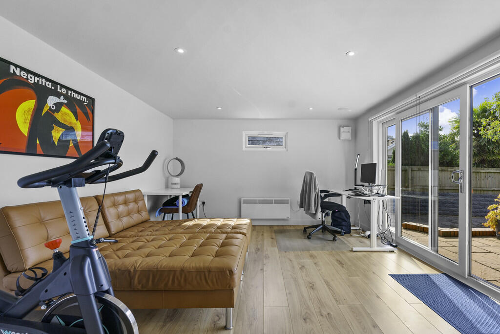 GARDENROOM16' 7" x 11' 7" (5.08m x 3.55m) An exceptional detached garden room located to the end of the rear garden. With power, lighting and hard wired internet connection. As well as integrated Bluetooth speakers. Sliding entrance doors with windows to either side. Laminate flooring. Electric radiator.