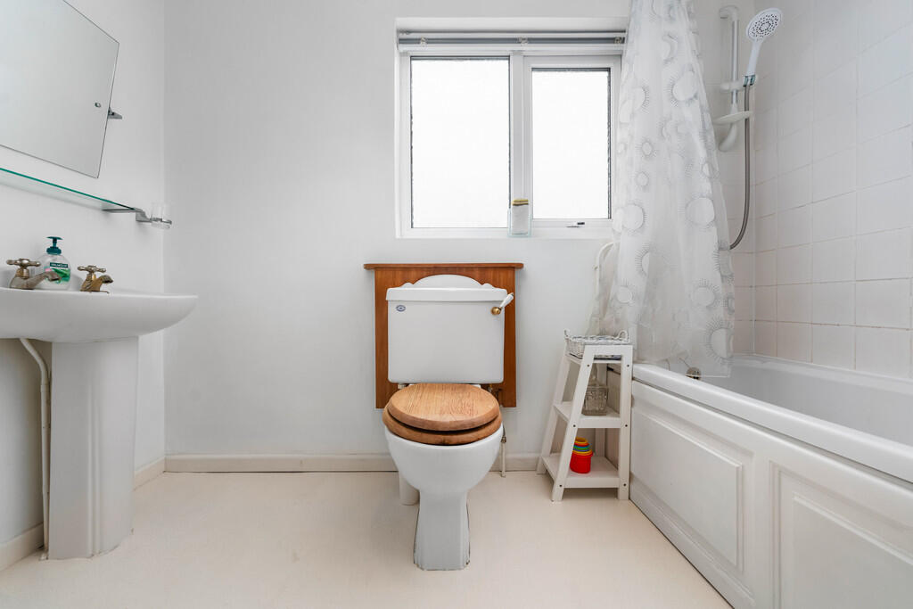 BATHROOM8' 9" x 5' 10" (2.67m x 1.78m) The bathroom comprises low level WC, pedestal wash hand basin and panelled bath with electric shower over. Tiled splash backs. Shaver point. Radiator. uPVC double glazed obscure window to rear. Door to large storage cupboard.