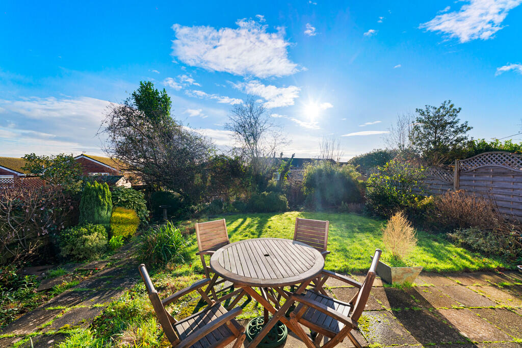 REARGARDEN A south facing rear garden mainly laid to lawn with shrub and hedge borders. Paved patio. Boundary fence. Outside tap.