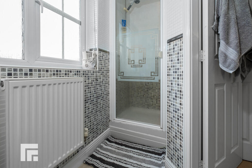 ENSUITESHOWERROOM Modern white suite comprising low level wc, wash hand basin, shower cubicle with 'Mira' shower above. Mosaic style wall tiling. Obscured glass window to front. Extractor fan. Radiator. Electric shaver point.