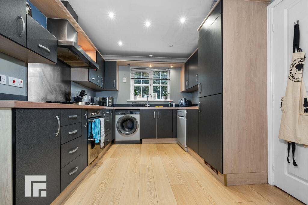 KITCHENANDDININGROOM18' 7" x 9' 0" (5.67m x 2.75m) Kitchen well appointed along three sides in grey finish fronts beneath a matching style laminate worktop surface. Inset stainless steel sink with side drainer. Inset five ring gas hob with cooker hood above and oven below. Plumbing for washing machine and dishwasher. Integrated fridge freezer. Matching range of eye level wall cupboards. Window to front and french doors to the rear garden. Laminate flooring. Ample space for large family dining table. Radiator.