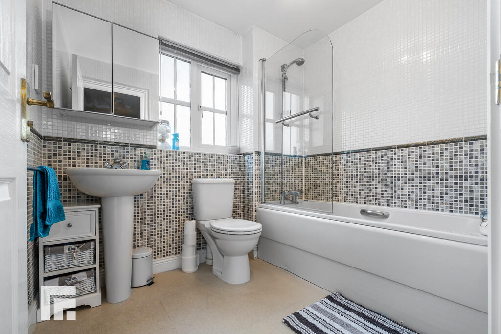 FAMILYBATHROOM7' 5" x 6' 2" (2.28m x 1.88m) Modern white suite comprising low level wc, wash hand basin, panelled bath with shower mixer tap. Mosaic style wall tiling. Obscured glass window to front. Electric shaver point. Extractor fan. Radiator.