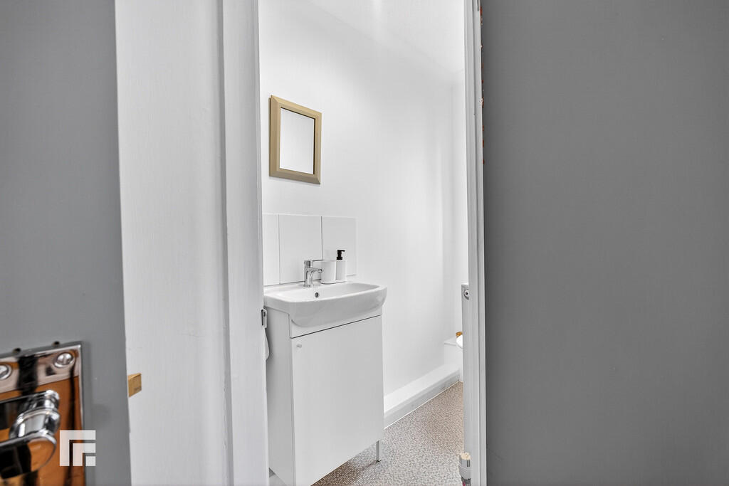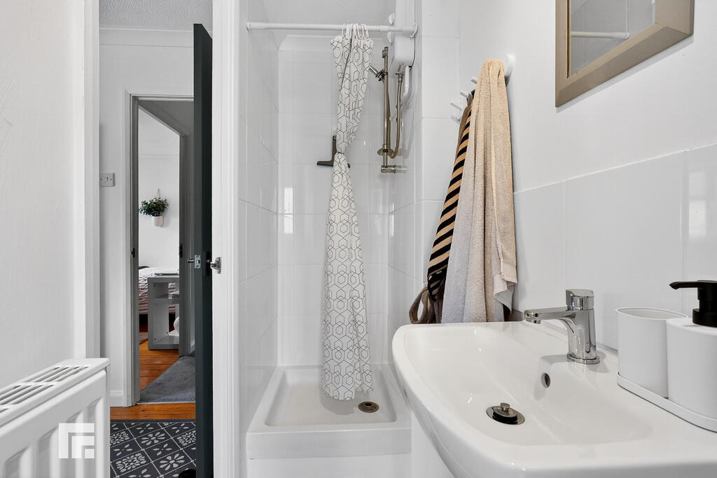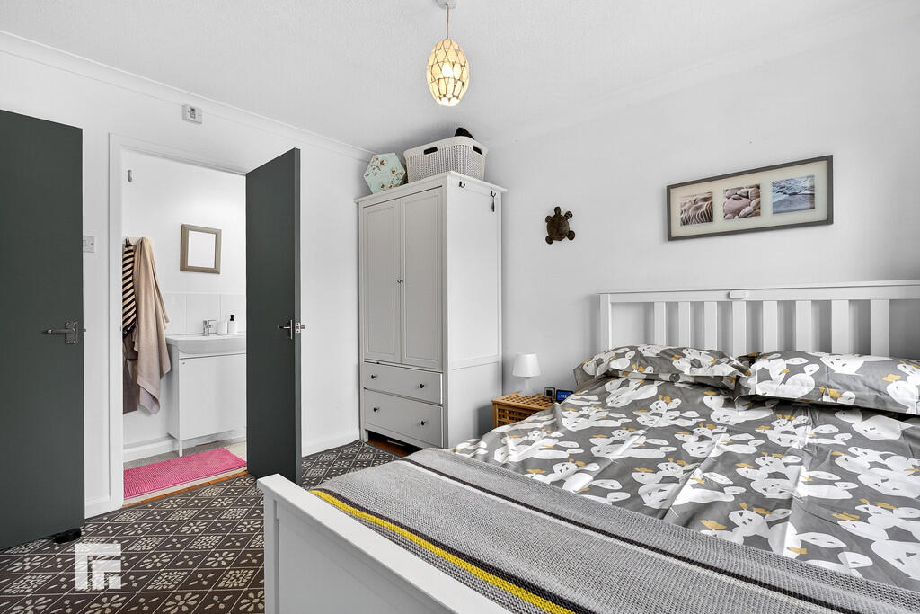 ENSUITE10' 0" x 2' 11" (3.07m x 0.89m) White suite; low level WC, wash hand basin with chrome mixer tap and vanity, shower cubicle with chrome electric shower. Tiled splashbacks. Radiator. Moisture sensitive extractor fans. uPVC window to side.