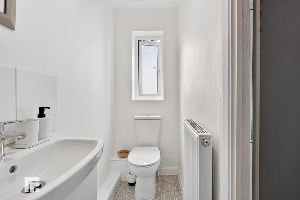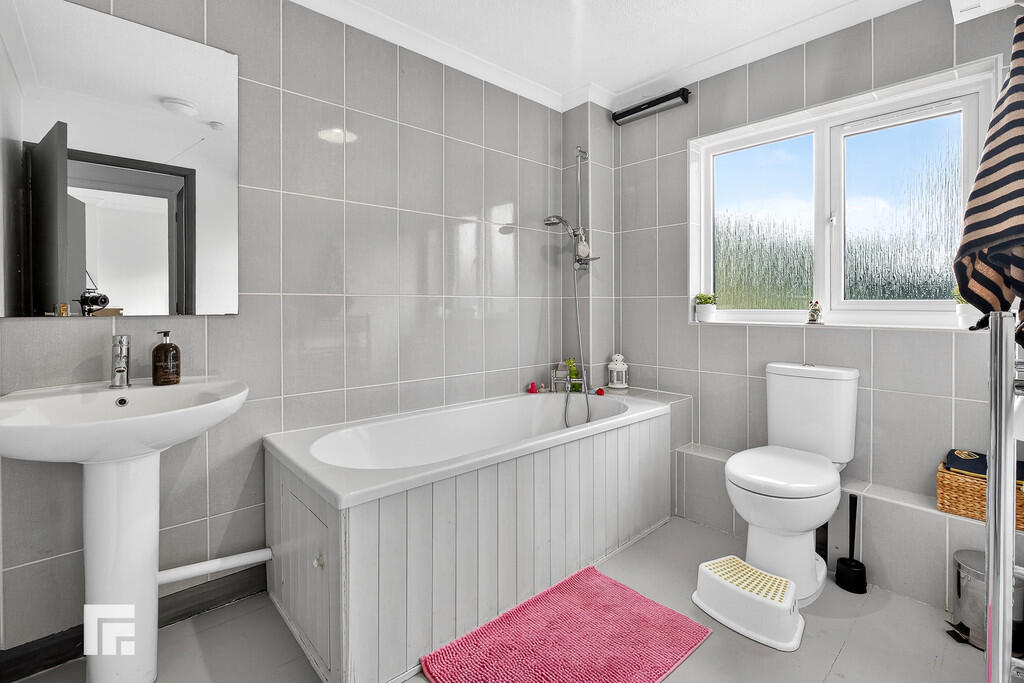FAMILYBATHROOM9' 0" x 6' 7" (2.75m x 2.01m) White suite; low level WC, pedestal wash hand basin with chrome mixer tap, bath with chrome mixer tap and chrome shower. Chrome heated towel rail. Tiled wall. Moisture sensitive extractor fans. Obscured glass window to rear.