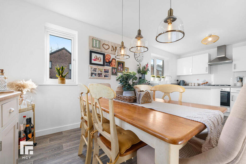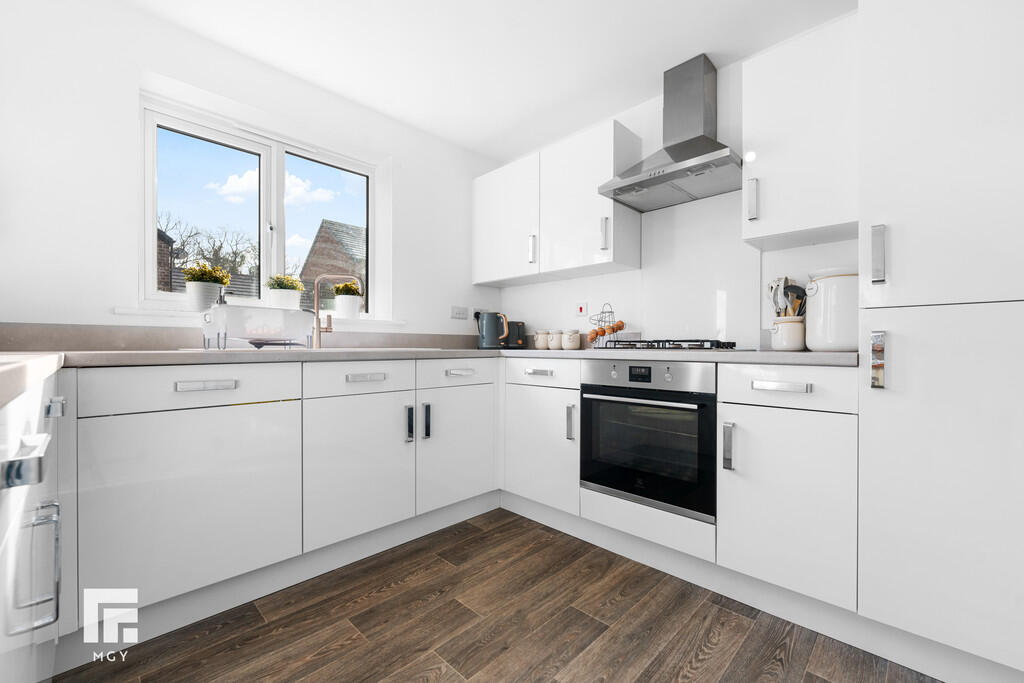 KITCHEN/DININGROOM18' 6" x 8' 10" (5.66m x 2.70m) Appointed along two sides with breakfast bar, a modern high gloss kitchen. Eye and low level cupboards beneath quality laminate worktops, integrated four ring gas hob, integrated oven, extractor hood, integrated fridge/freezer, integrated washing machine, ample space for dining table. Pantry style cupboard. Quality vinyl flooring. Two radiators. uPVC window to front. Two additional windows to side. Under stairs storage cupboard. Door to utility room.