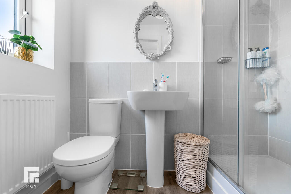 ENSUITE7' 1" x 3' 10" (2.16m x 1.17m) Modern white suite; low level WC, pedestal wash hand basin with chrome mixer tap, double shower with chrome shower and glass sliding door. Extractor fan. Radiator. Vinyl flooring. Obscured glass window to front.