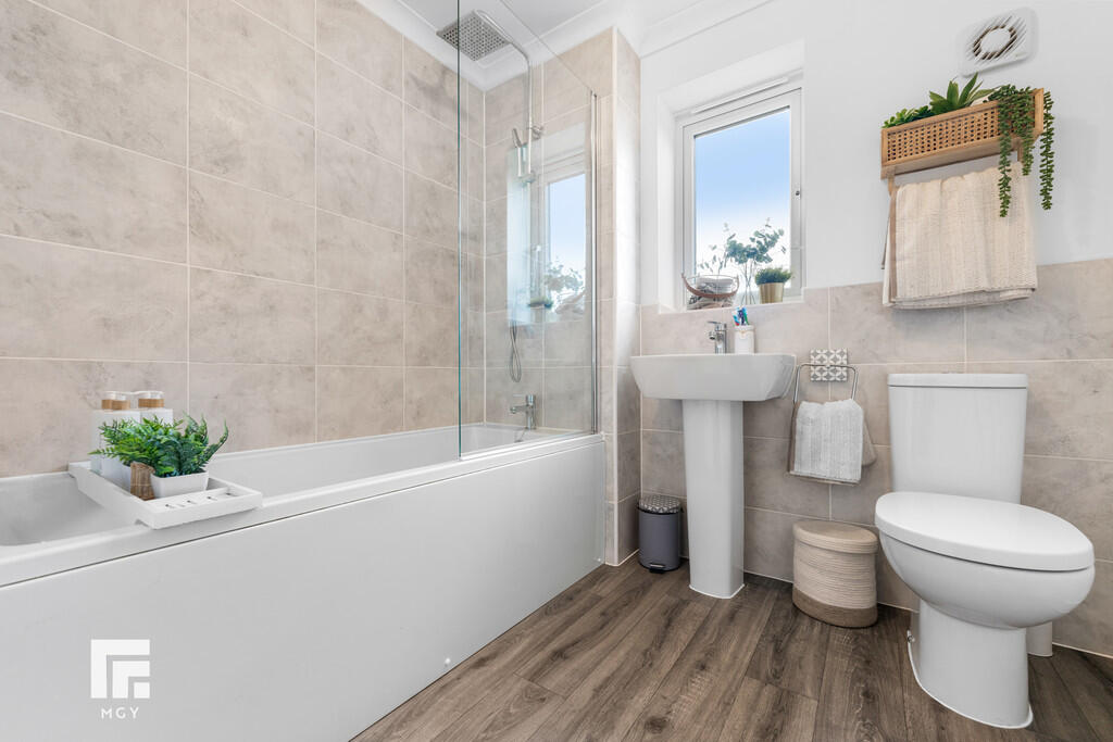 FAMILYBATHROOM6' 3" x 7' 1" (1.92m x 2.18m) Modern white suite; low level WC, pedestal wash hand basin with chrome mixer tap, bath with chrome mixer tap and chrome dual headed shower. Extractor fan. Radiator. Ruled splashbacks. Vinyl flooring. Obscured glass window to front.