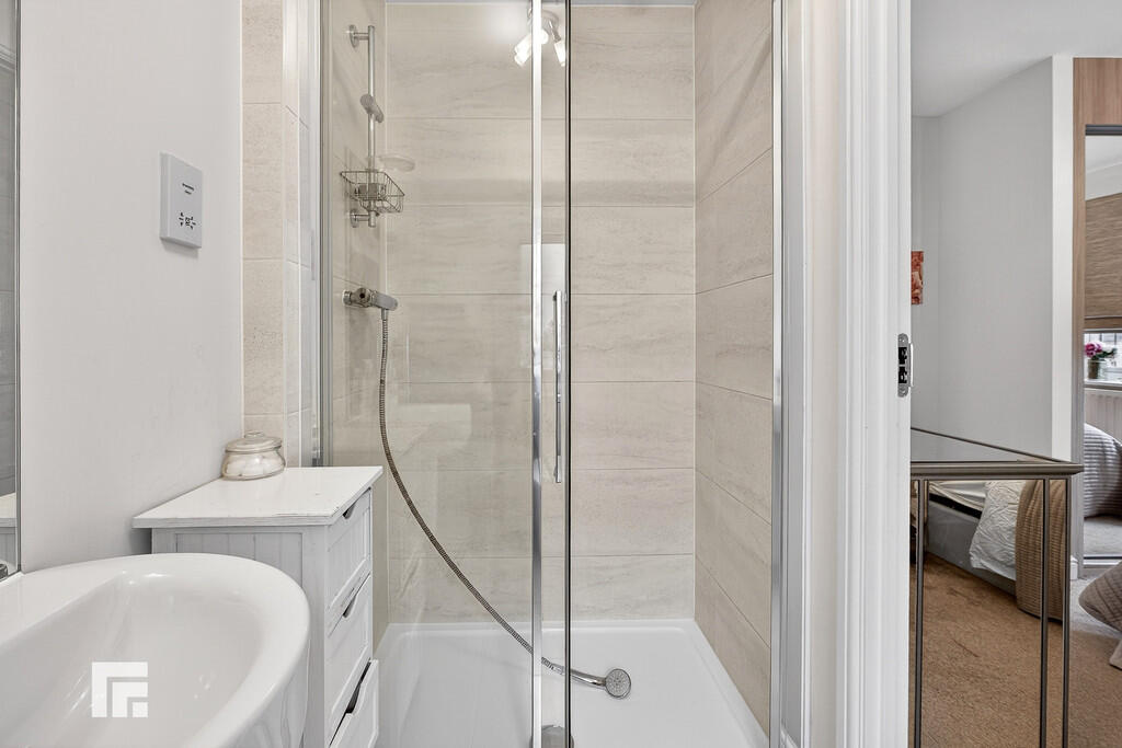 ENSUITE8' 3" x 4' 1" (2.53m x 1.27m) Modern white suite; low level WC, wall hung wash hand baron with chrome mixer tap, shower cubicle with chrome shower and glass sliding shower door. Extractor fan. Shaving point. Chrome heated towel rail. Tiled flooring. Obscured glass window to side.