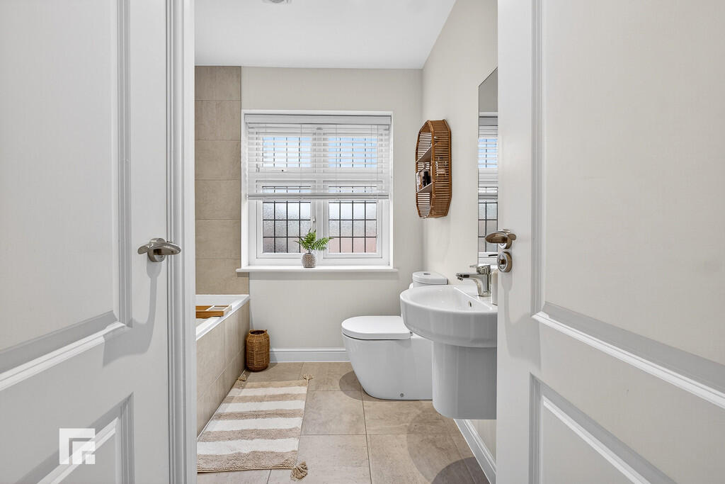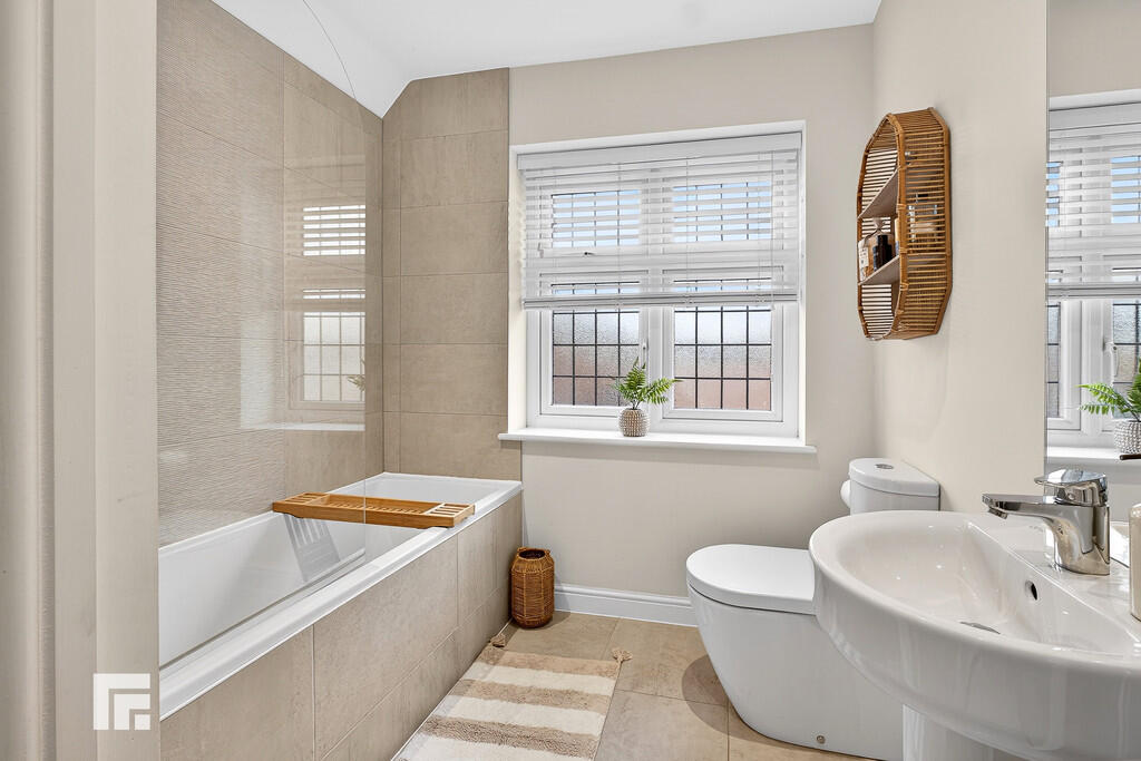 FAMILYBATHROOM8' 2" x 6' 10" (2.49m x 2.09m) Modern white suite; low level WC, wall hung wash hand basin with chrome mixer tap, bath with chrome mixer tap, chrome shower and tiled bath panel. Extractor fan. Chrome heated towel rail. Shaving point. Large built in storage cupboard. Tiled splashback and flooring. Obscured glass window to front.