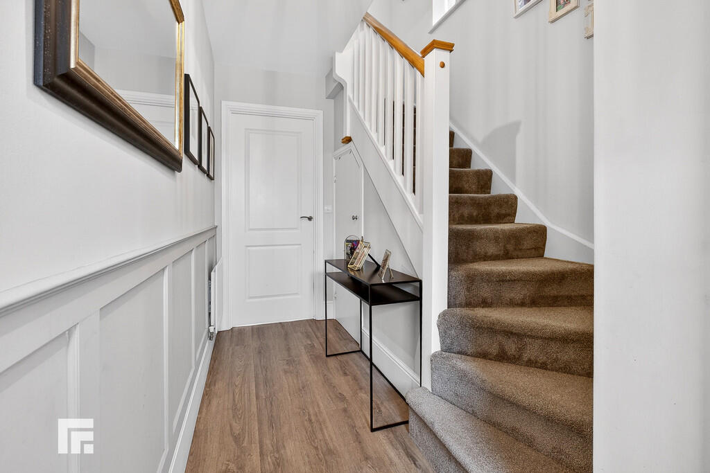 ENTRANCEHALL Entered via a modern composite door, 'LVT' flooring. Modern wall panelling. Radiator. Built in understairs cupboard. Stairs leading to first floor. Doors to all rooms.