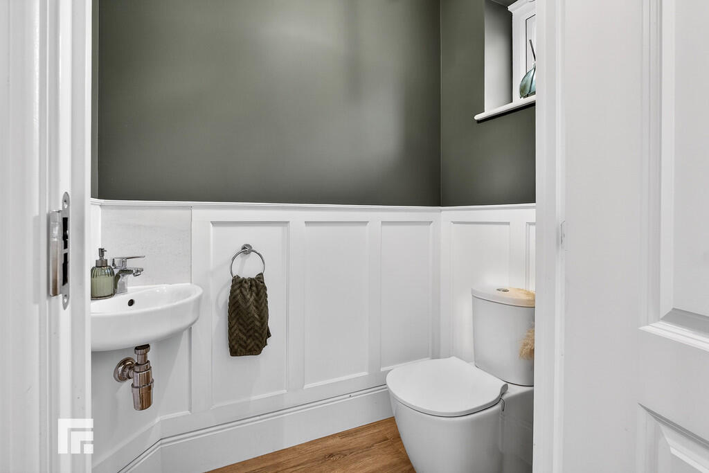 CLOAKROOM5' 8" x 3' 1" (1.73m x 0.96m) Modern white suite; low level WC and wall hung wash hand basin with chrome mixer tap. Modern wall panelling. Radiator. Obscured glass window to front. Continuation of 'LVT' flooring from hallway.