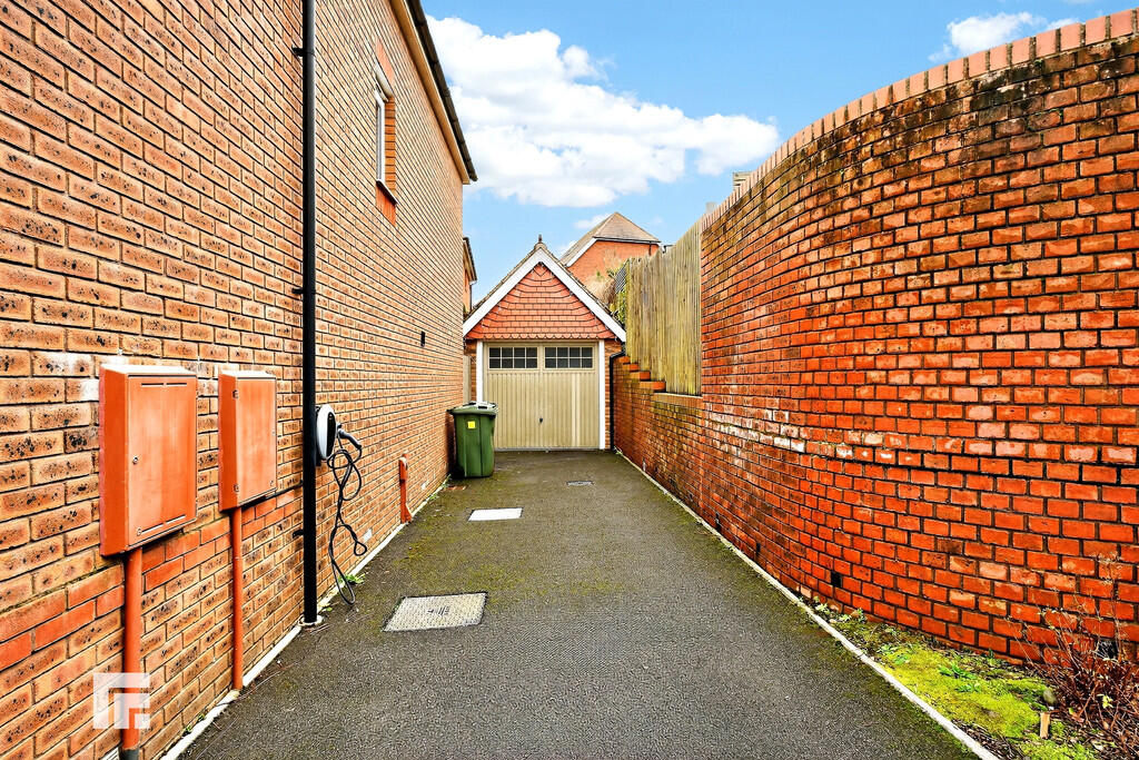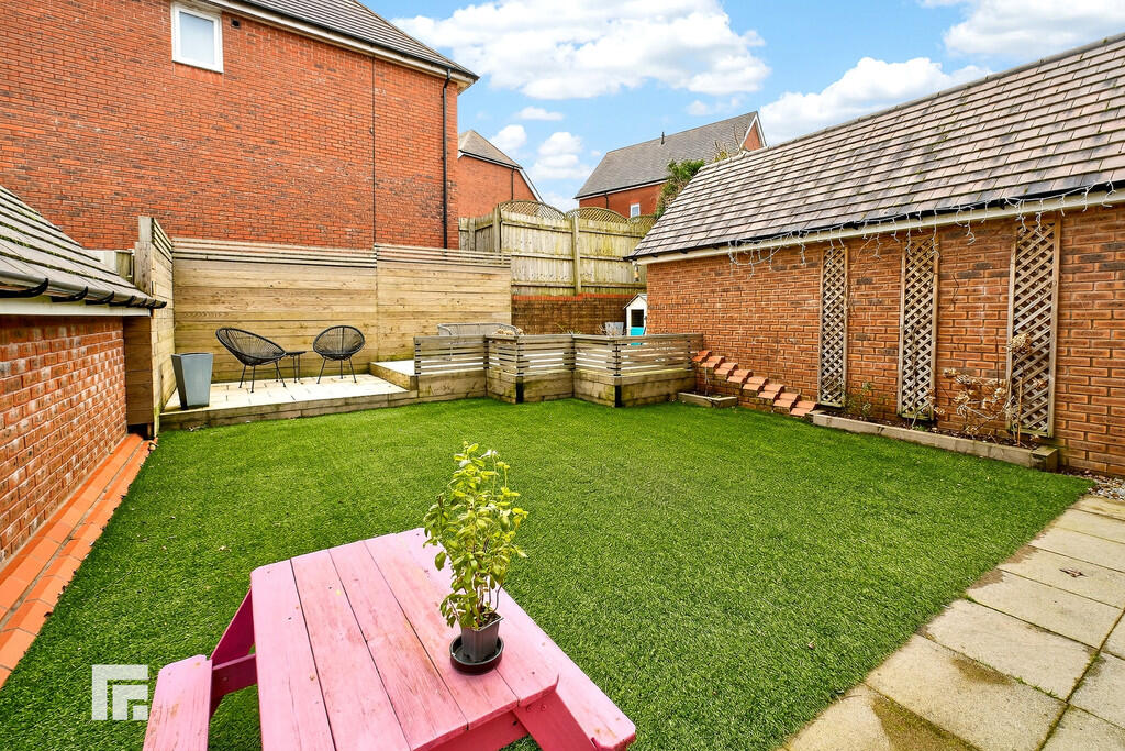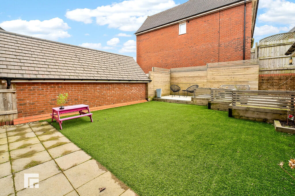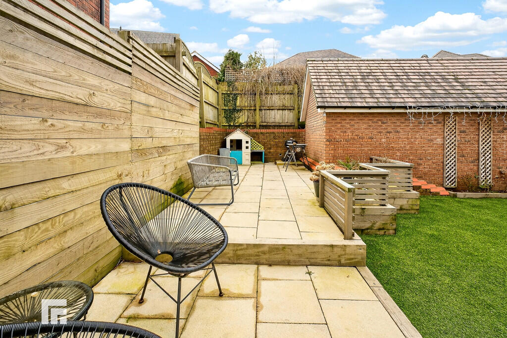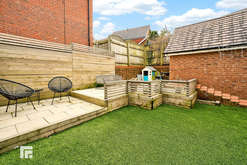 REARGARDEN A beautifully landscaped, sunny, South easterly facing rear garden. Boarded by a brick wall and timber fence, paved patio leading to a large area of artificial lawn. Wooden sleepers and balustrade bordering a further, raised, paved patio seating/barbecue area. Outside tap. Timber gate to side leading to driveway and garage.