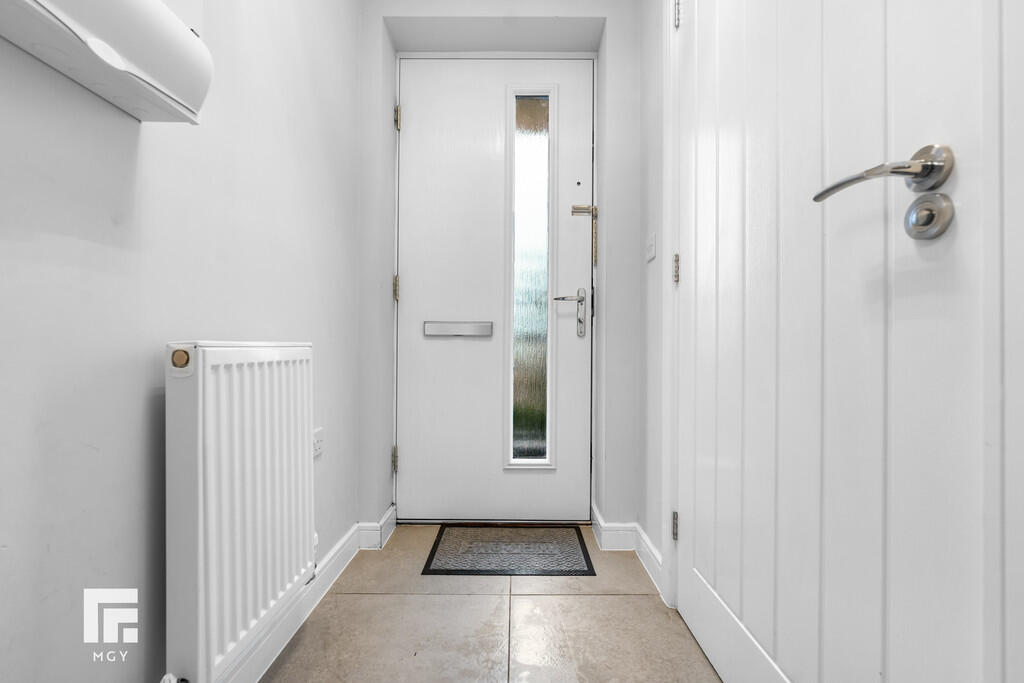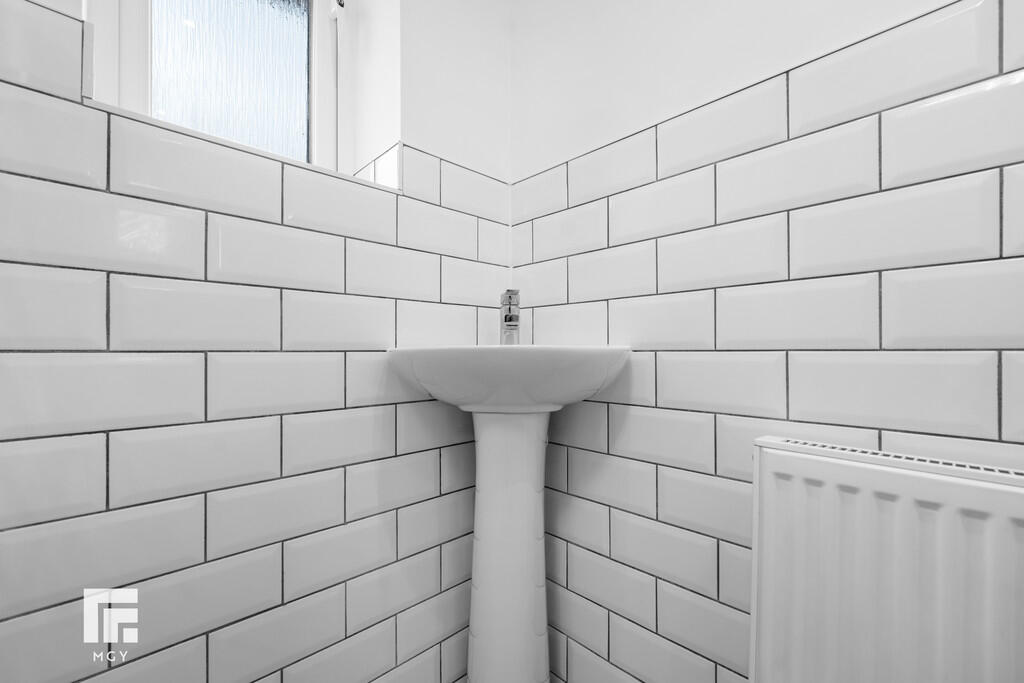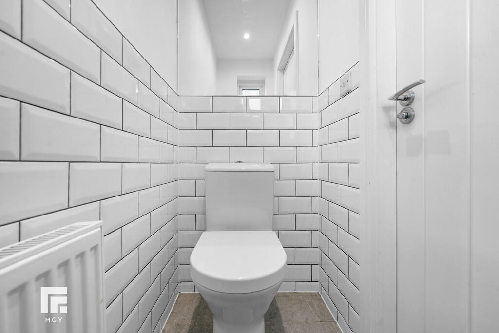 CLOAKROOM Modern white suite comprising low level wc, wash hand basin. Tiled flooring. Wall tiling to splash back areas. Obscured glass window to front. Radiator.