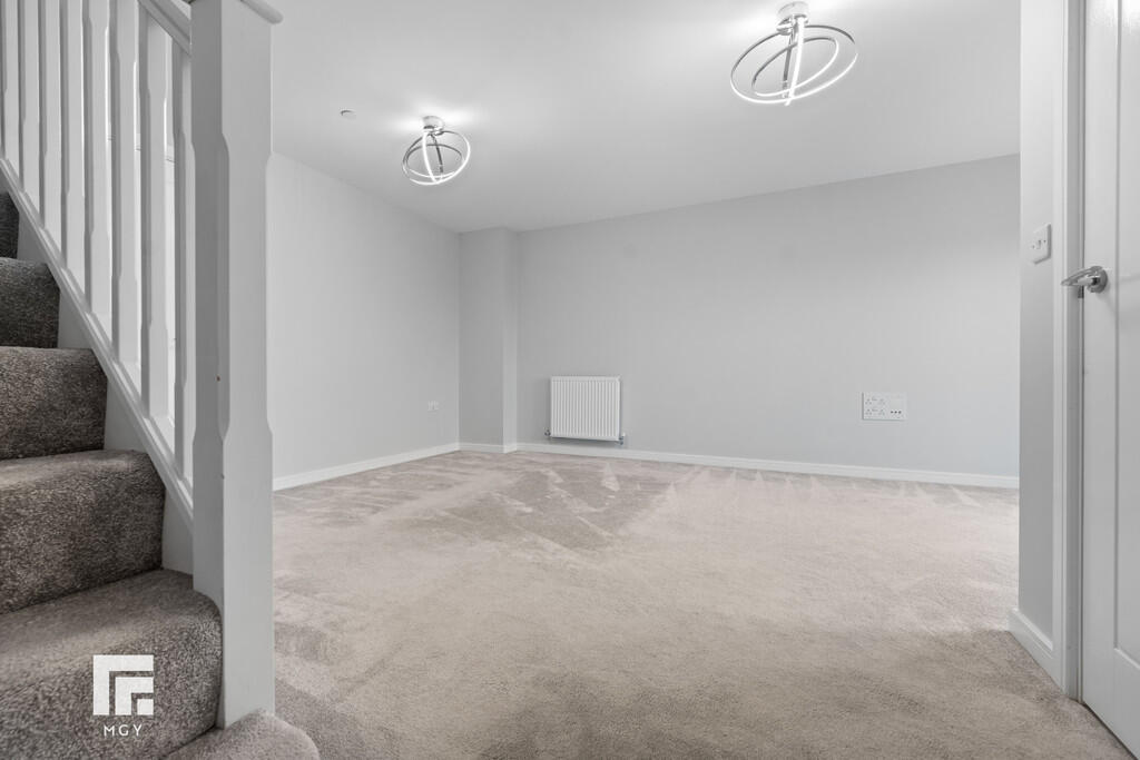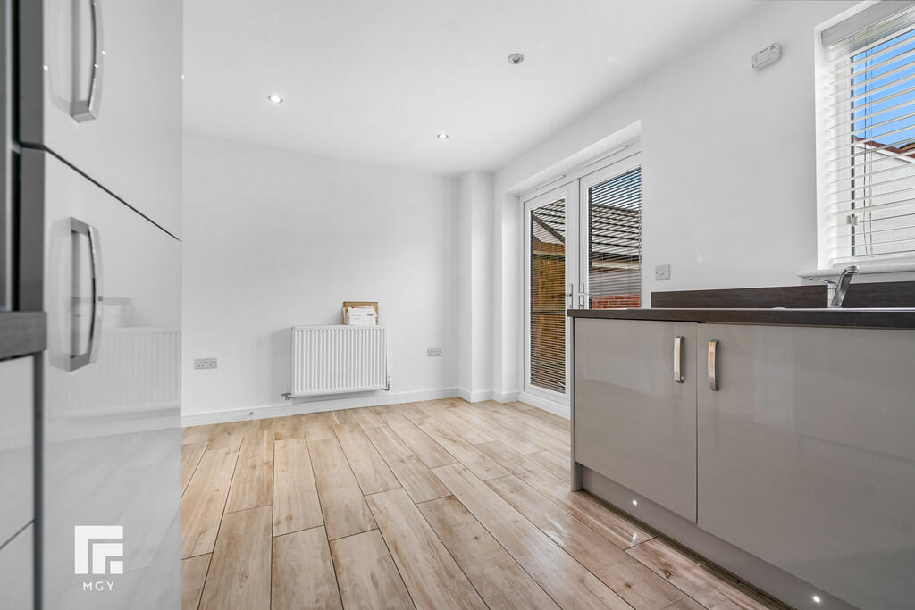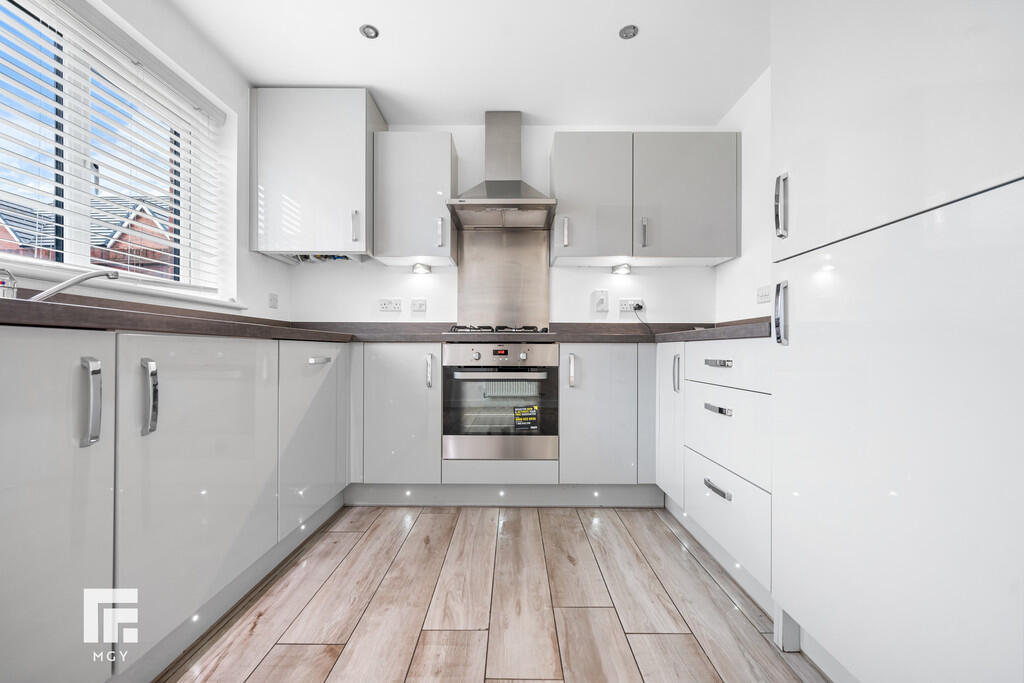 KITCHENANDDININGROOM14' 9" x 9' 1" (4.52m x 2.78m) Appointed along three sides in light grey high gloss fronts with chrome handles beneath laminate worktop surfaces. Inset 1.5 bowl stainless steel sink with side drainer. Inset four ring gas hob with cooker hood above and oven below. Integrated fridge and freezer. Integrated dishwasher. Integrated washing machine. Matching range of eye level wall cupboards. Concealed 'Ideal Logic' combi gas central heating boiler. Recessed spotlights. Under stairs storage cupboard. Window to rear and french doors to the garden. Ample space for family dining table. Tiled flooring. Radiator.