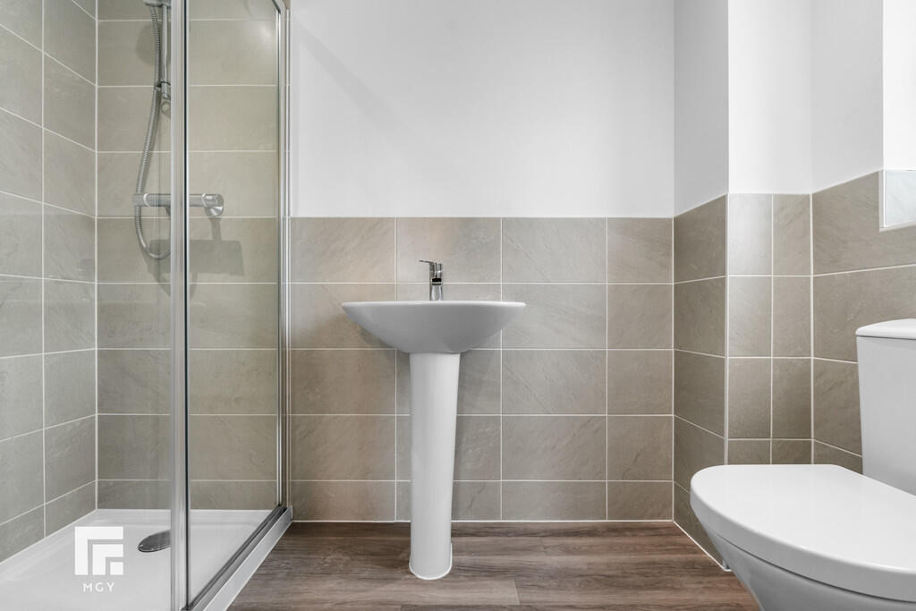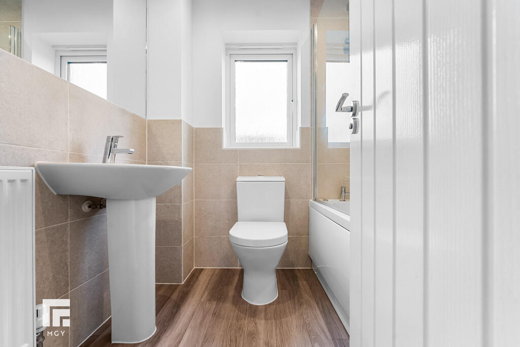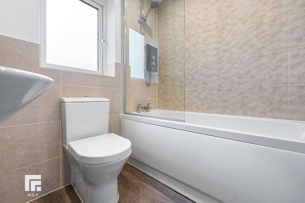 FAMILYBATHROOM Modern white suite comprisng low level wc, wash hand basin, panelled bath with shower above and svivel shower screen. Wall tiling to splash back areas. Obscured glass window to rear. Extractor fan. Radiator.