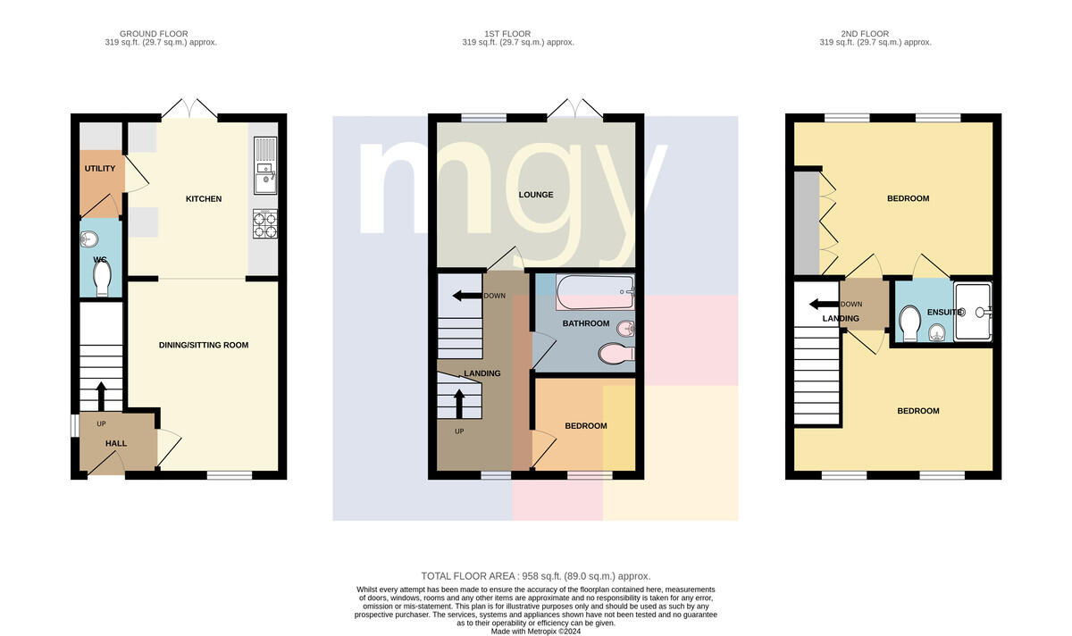 A three storey end of terrace property in the popular village of Radyr. To the front are views over the green and park area. Accommodation briefly comprises hallway, dining/sitting room, kitchen, utility room and cloakroom. To the first floor there is a lounge, bathroom and bedroom. To the second floor there are two further bedrooms, one with en-suite shower room. Rear garden, single garage with parking space. Gas central heating. EPC Rating: C