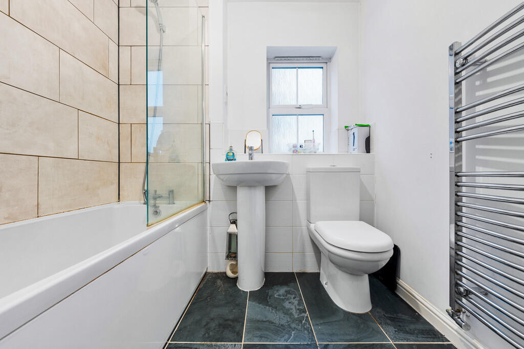 BATHROOM7' 1" x 6' 5" (2.18m x 1.96m) A white suite to include low level WC, pedestal wash hand basin, and panelled bath with shower over and glass screen. Tiled floor and splash backs. Ladder radiator. Extractor fan and shaver point. uPVC double glazed window to side.