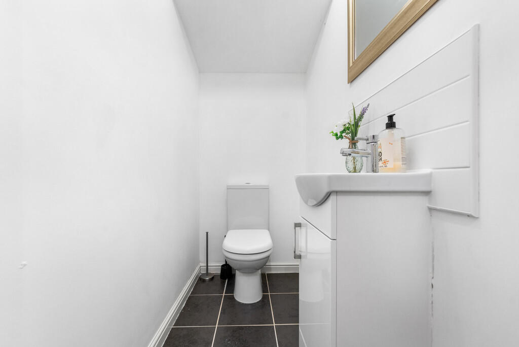 CLOAKROOM6' 5" x 3' 2" (1.98m x 0.99m) Low level WC and vanity enclosed wash hand basin. Tiled flooring and splash backs. Radiator.