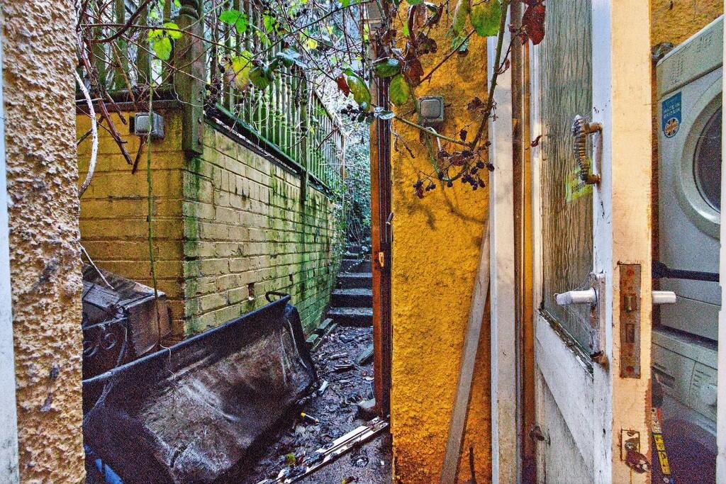 OUTSIDE Rear - Enclosed courtyard with steps up to rear garden. Doors to three outbuildings.