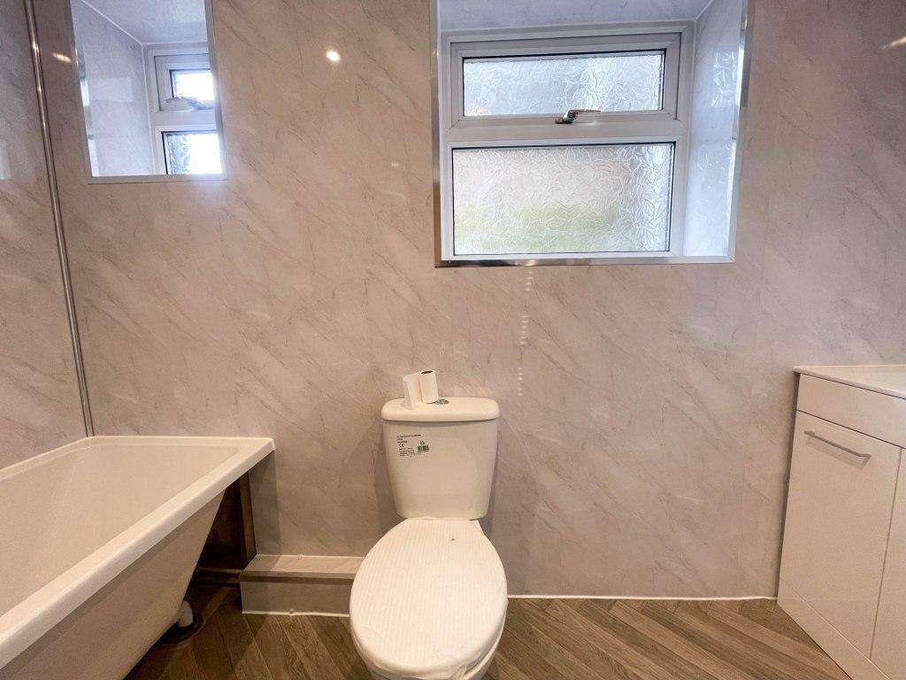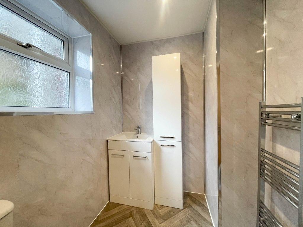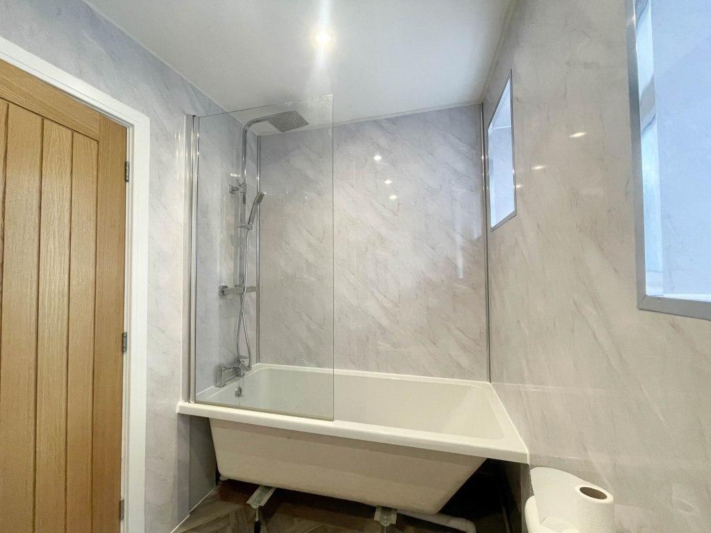 BATHROOM Luxury bathroom suite, with bath with over head shower, vanity wash hand basin and linen cupboard, low level wc, grey marble wall panelling, inset spotlighting, vinyl flooring, window to side. Chrome heated radiator.
