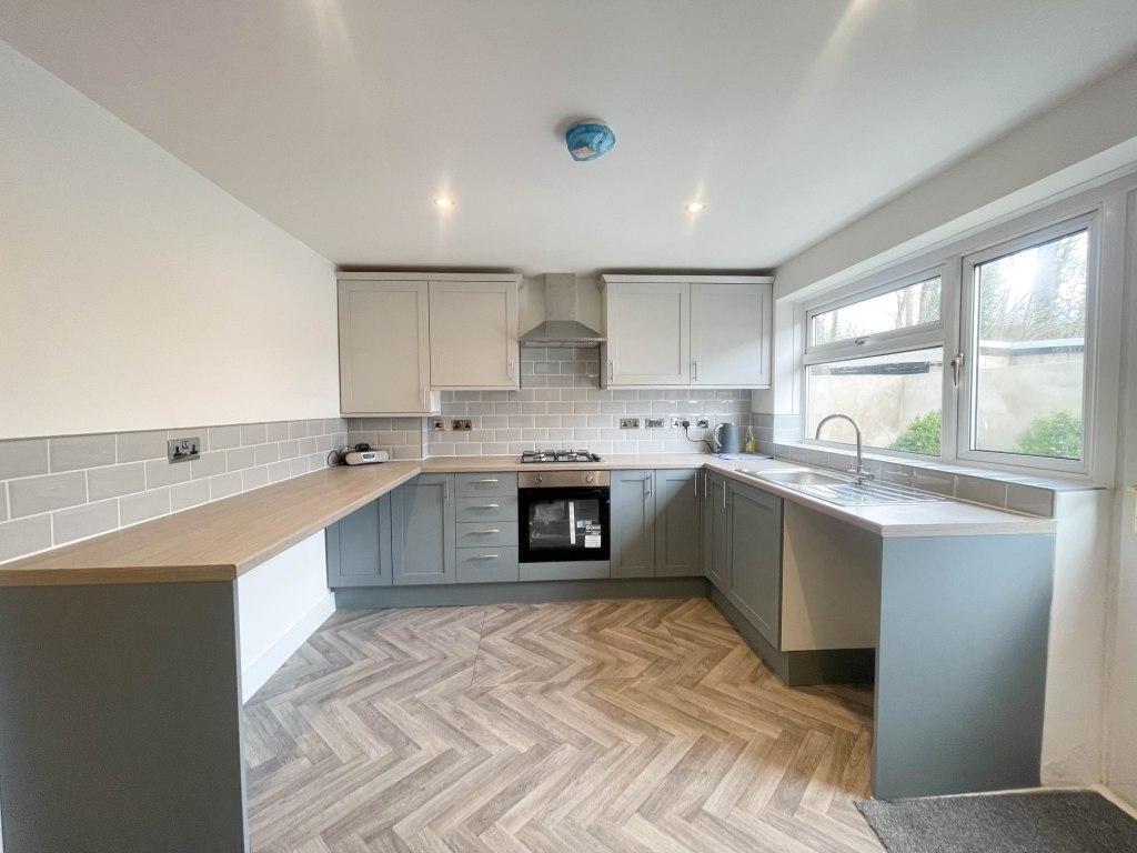 KITCHEN/DINER13' 0" x 10' 0" (3.96m x 3.05m) Fitted kitchen with an extensive range of base and wall units finished in matt grey with matching grey ash worktops, tiled wall splashback, single drainer, built in oven and gas hob, extractor fan, space for a fridge and freezer, plumbing for a washing machine, vinyl flooring, access to a walk in under-stairs storage cupboard, solid panel oak door to the bathroom, plaster skimmed ceiling with inset spotlighting, rear facing window and exit door leading out to the garden. Radiator.