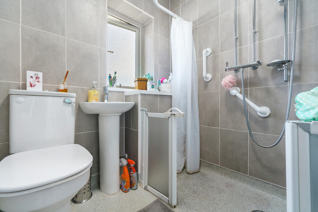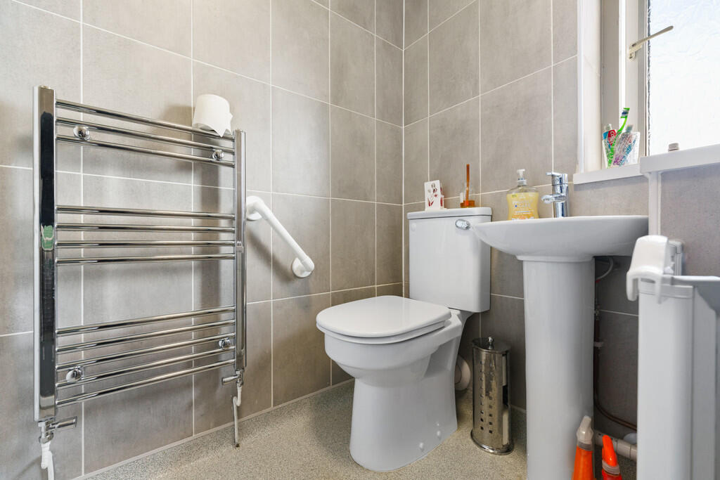 BATHROOM Upvc obscure double glazed window to rear. Tiled walls. Three piece suite comprising of shower with seating, pedestal wash hand basin and wc. Chrome heated towel rail.